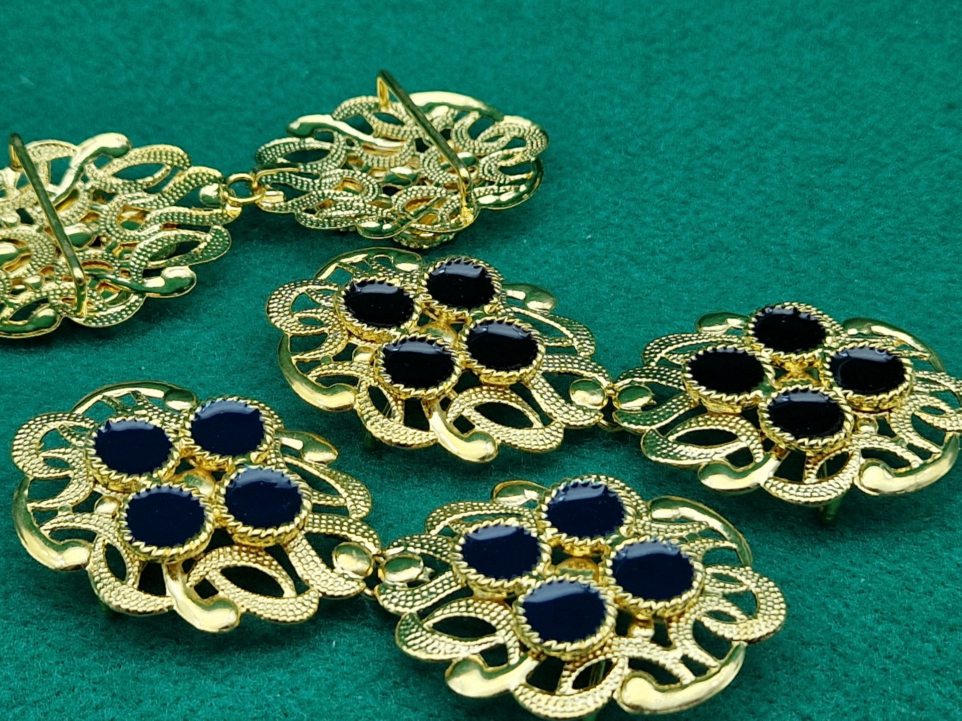Agganciatura in ottone dorato e traforato, smaltata accuratamente a mano, proposta in due varianti: colore blu oceano, molto scuro, e nero assoluto.