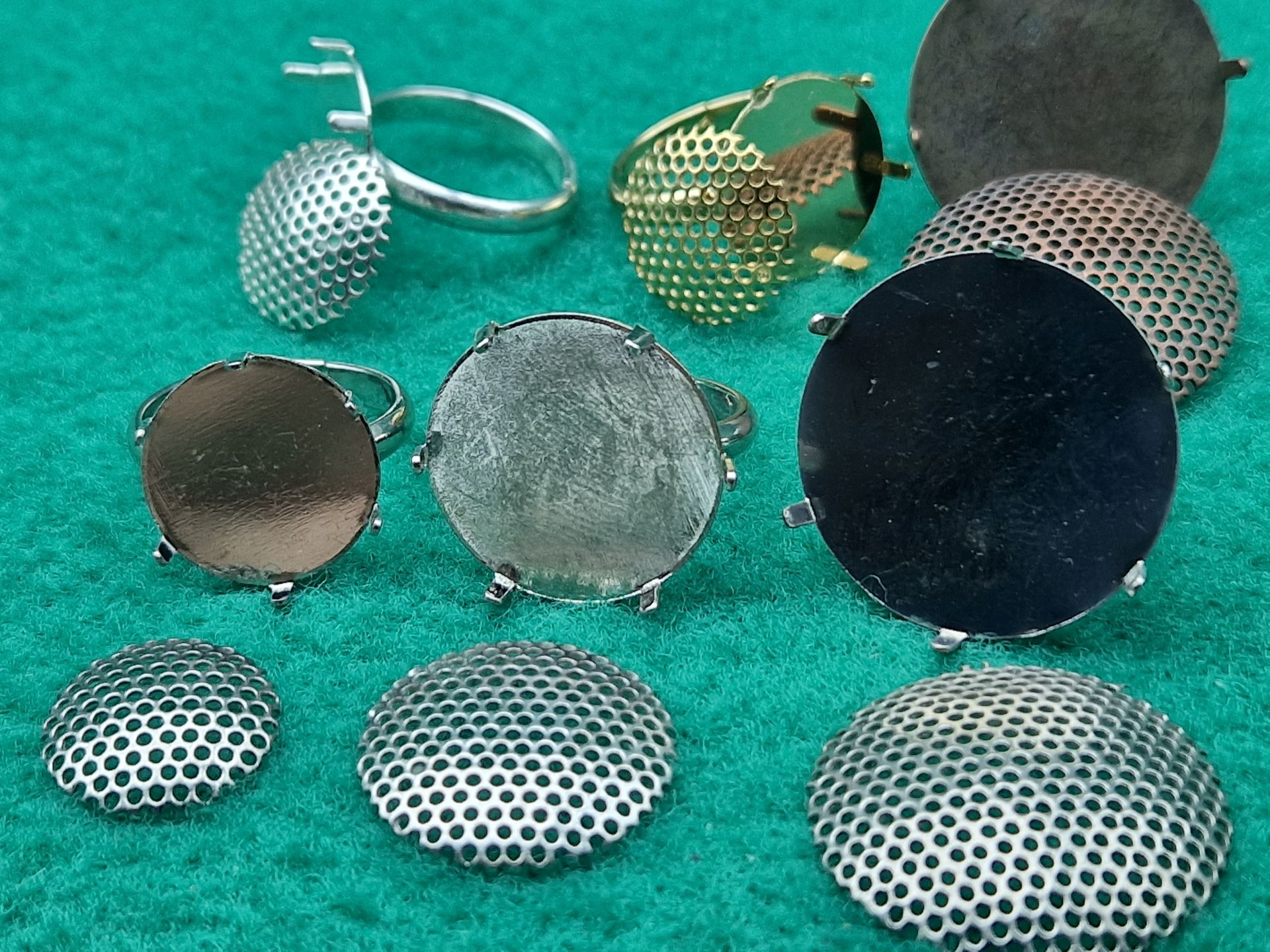 Anello regolabile con castone a graffe e disco forato, leggermente bombato, per poter essere ricamato, realizzato in pregiato ottone, disponibile in tre misure e quattro finiture.