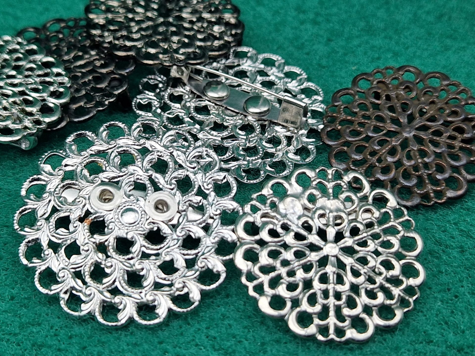 Base per spilla da ricamare con decorazione in metallo traforato, proposta in tre finiture, nichel , inusuale rame antico e ossido.