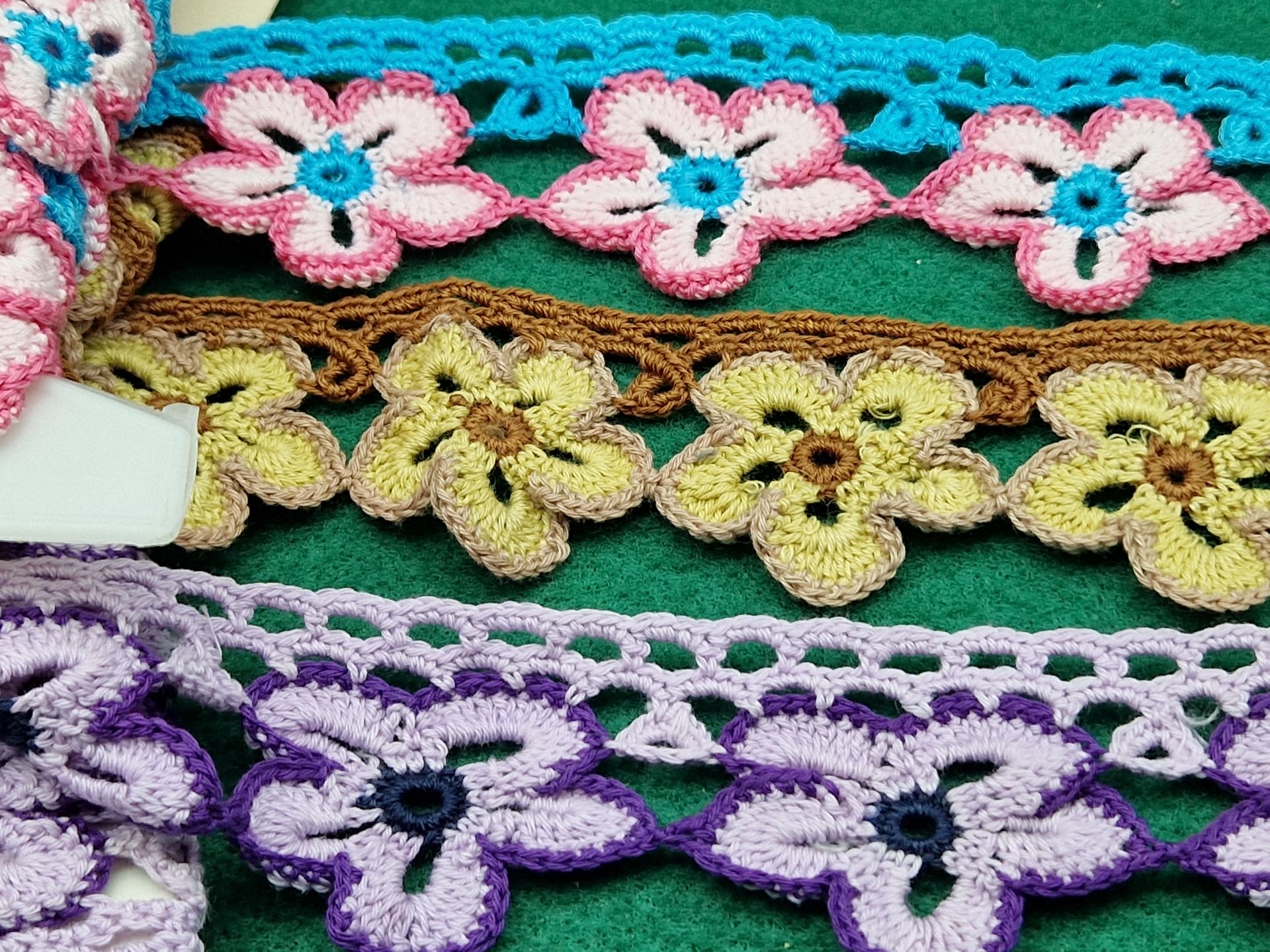 Bordura realizzata a mano, con filo di cotone di vari colori, creata a uncinetto.