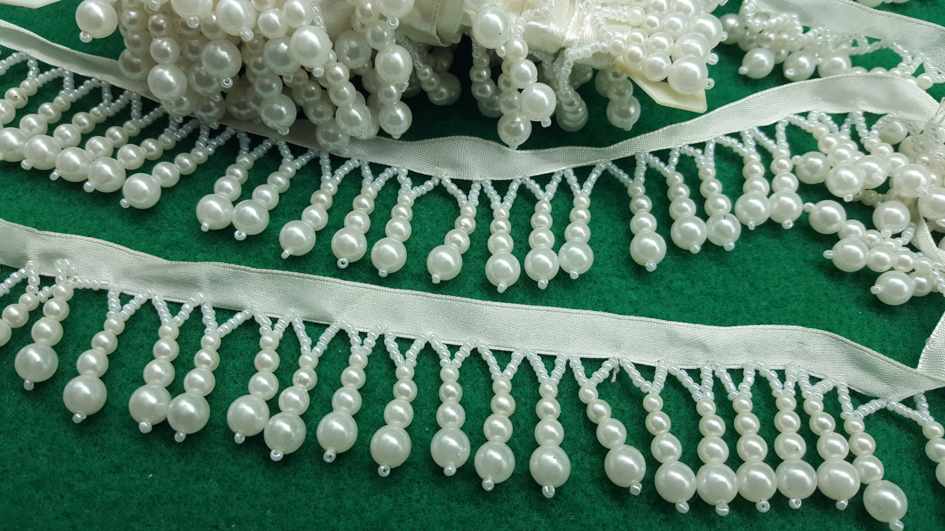 Bordura in raso con elaborati pendenti composti da perle madreperlate, un’insolita e pregiata frangia, altezza cm 3,5 circa.