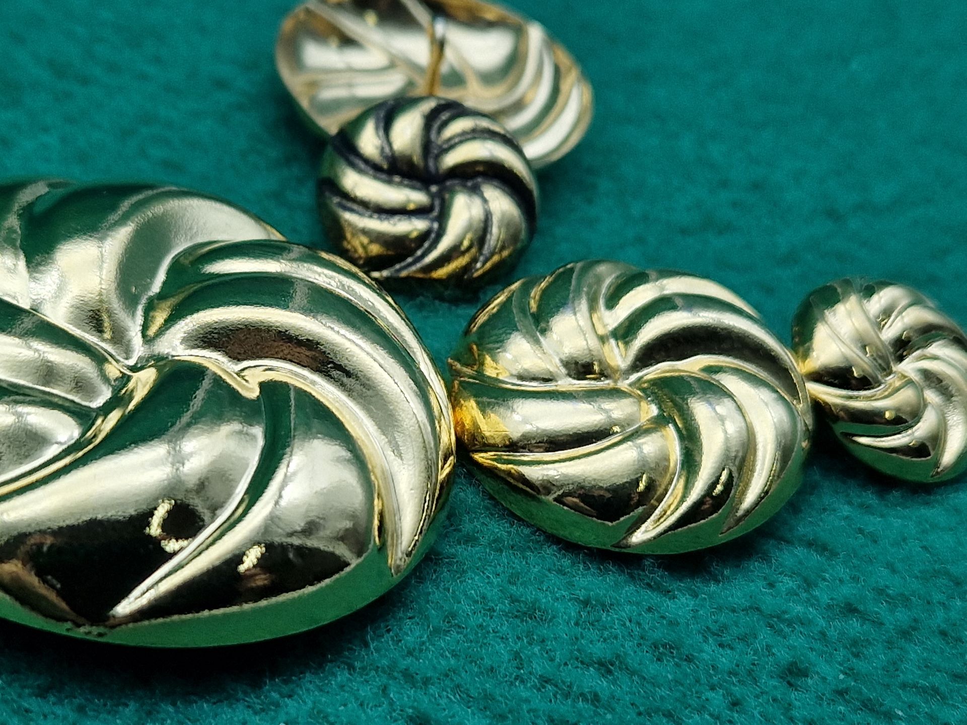Bottoni dorati a girandola, in pregiato ottone, leggerissimi e lucidissimi, con gambino, disponibili oro e oro antico in tre misure.