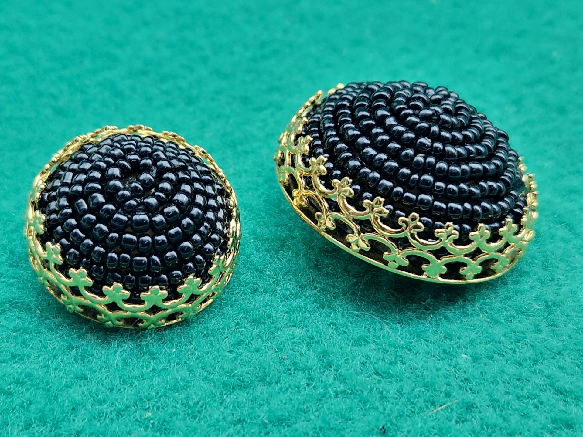 Bottoni con base in pregiato ottone dorato ricamati a mano con perline in vetro di colore nero assoluto, disponibili in due misure.