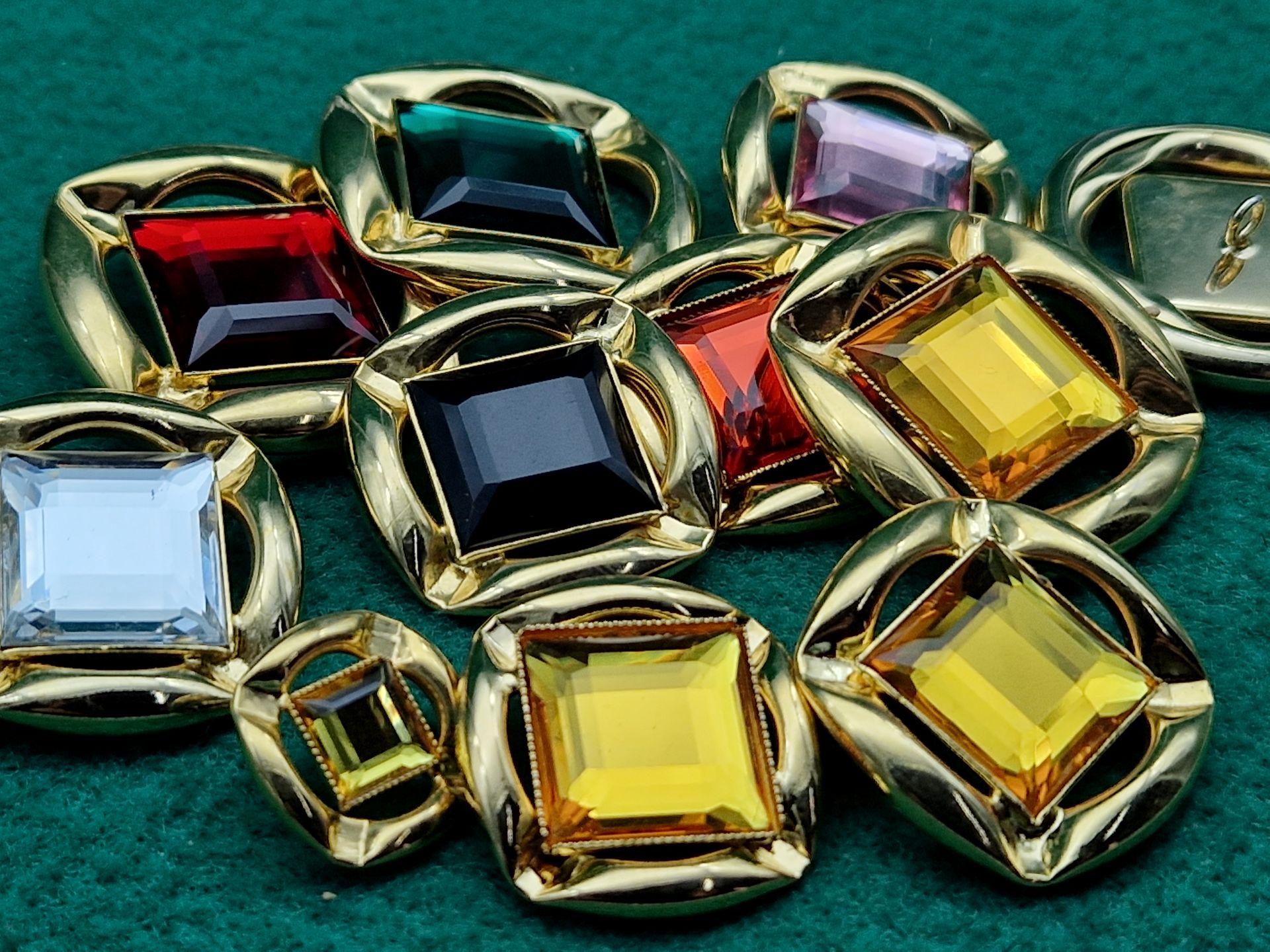 Bottoni dorati con pietra acrilica sfaccettata e colorata, realizzati in pregiato ottone, con gambino, disponibili in quattro misure.