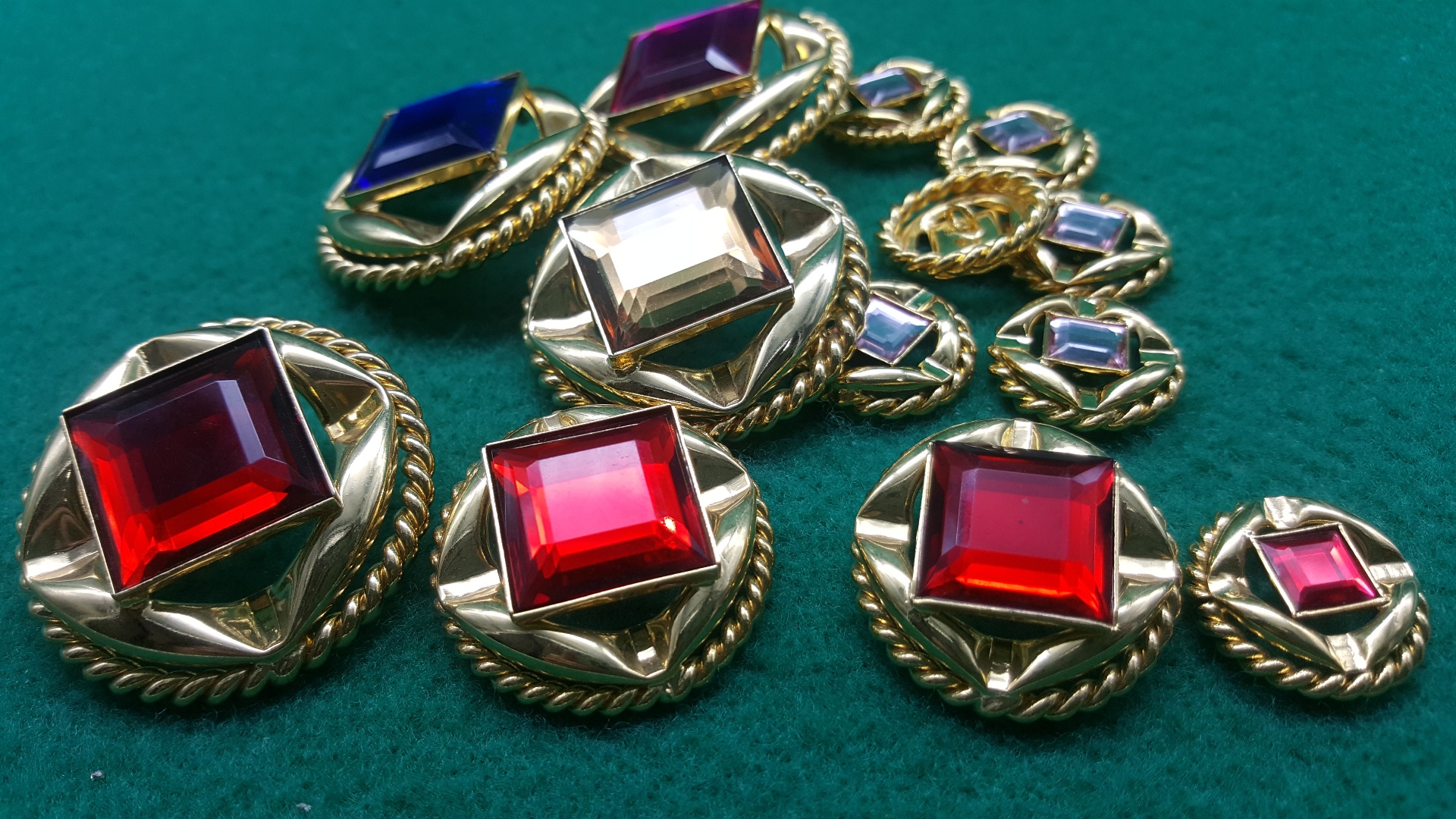 Bottoni dorati con pietra acrilica quadrata, di vari colori, creazione artigianale esclusiva realizzata in pregiato ottone.