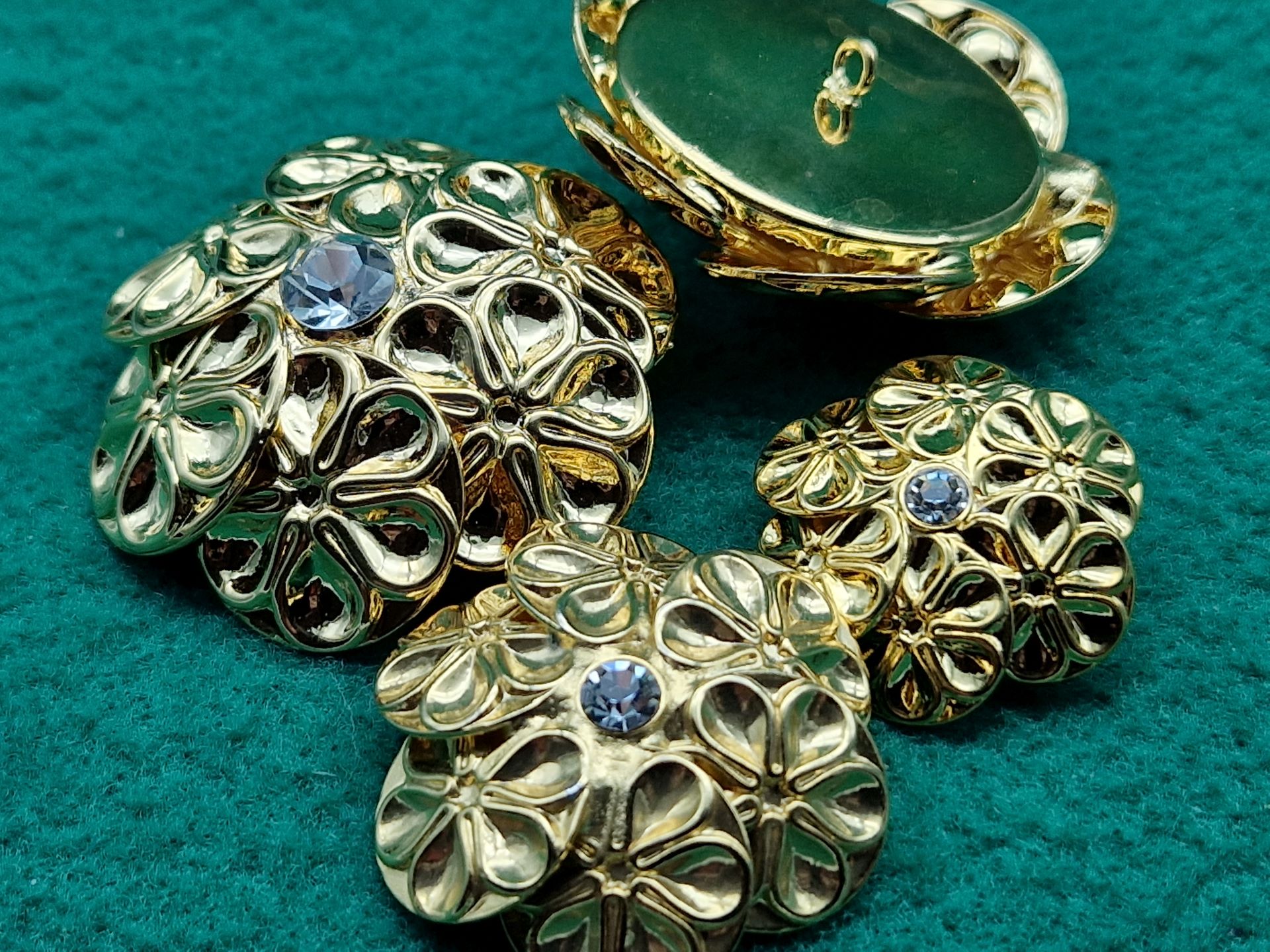 Bottoni realizzati in pregiato ottone dorato, con strass al centro, disponibili in tre misure, di forma a fiore a sei petali, considerato simbolo di protezione.