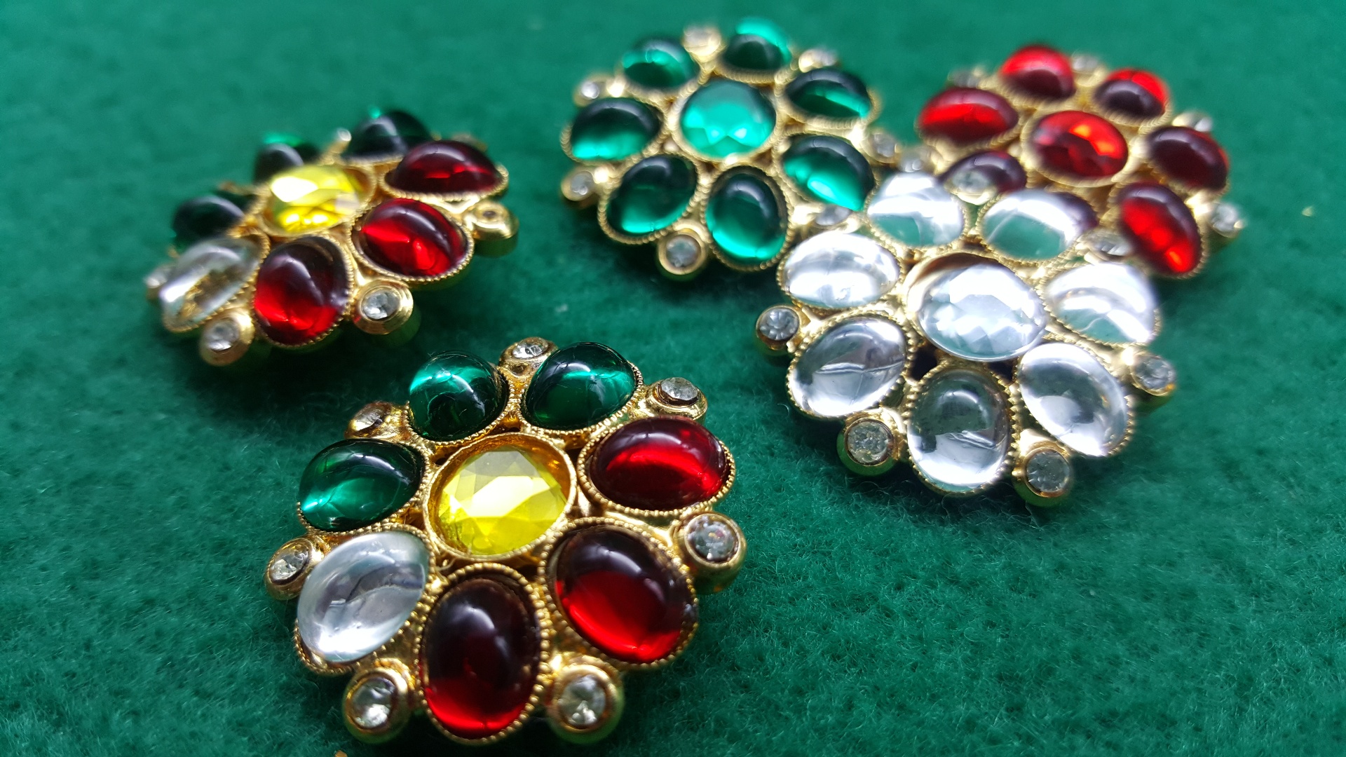 Bottoni in metallo con pietre acriliche ovali e a rosetta, lisce e sfaccettate, rosso rubino, verde smeraldo o cristallo, alternate a piccoli ma luminosi strass.