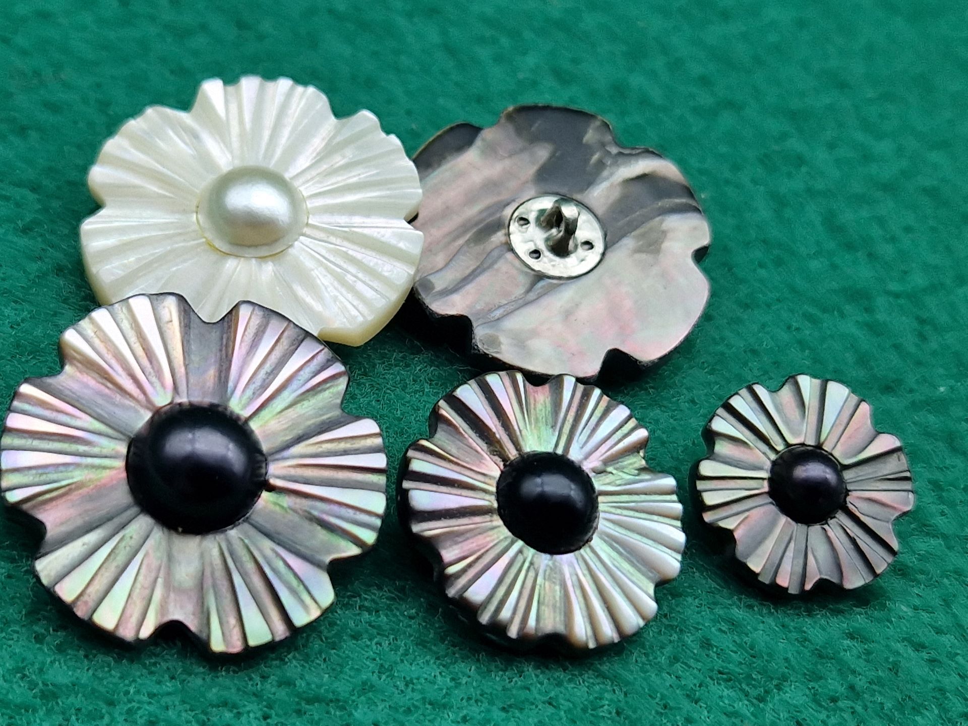 Bottoni in madreperla, dalle caratteristiche iridescenze, disponibile in tre misure e due colori, realizzati con diverse varietà di madreperla, sagomati e incisi al laser con gambino in metallo e perla centrale.