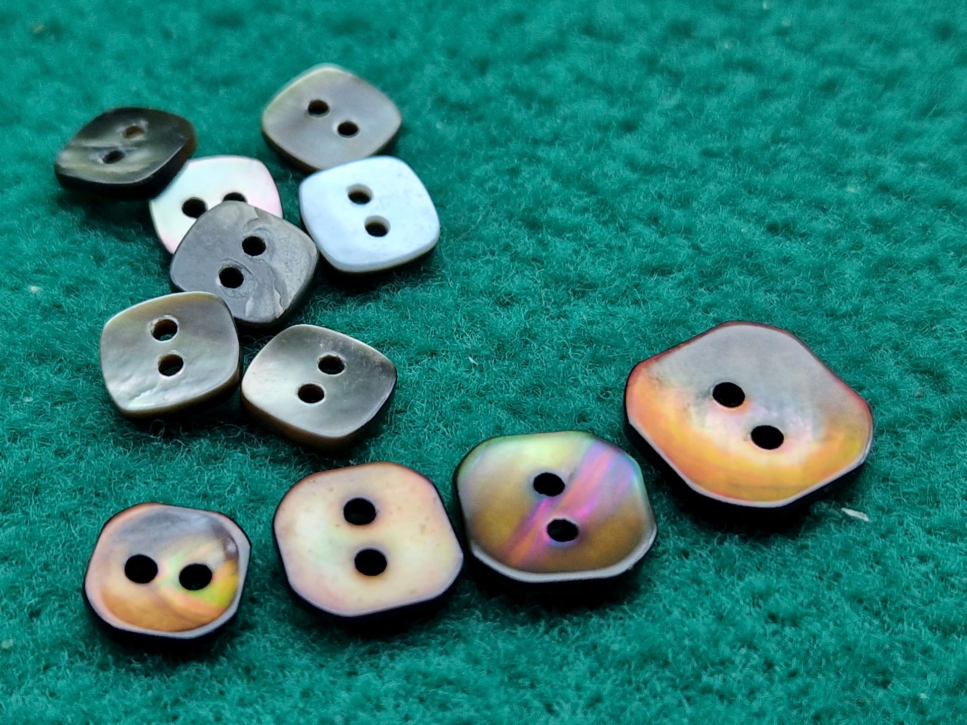 Bottoni madreperla Tahiti, diffusa nell’oceano indiano, di forma squadrata a 2 fori, disponibili in quattro misure nel naturale colore grigio argenteo e nel raffinato colore cioccolato, ottenuto tramite apposita tintura, che esalta le naturali iridescenze.