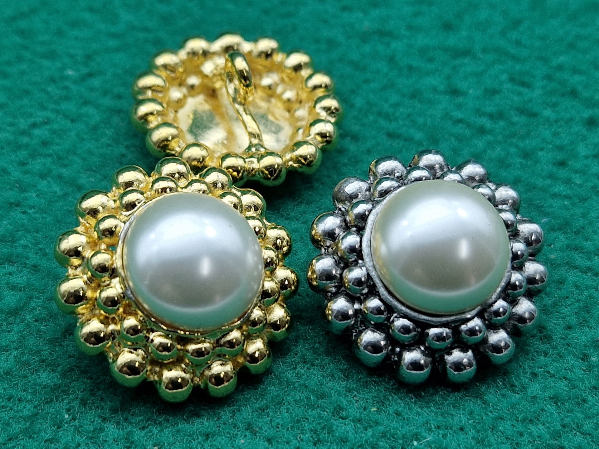 Bottoni metallo con doppio bordo composto da catena a sfere e grande perla madreperlata centrale, con gambino, disponibili in misura/lineato 46 = diametro mm 28, in due finiture.