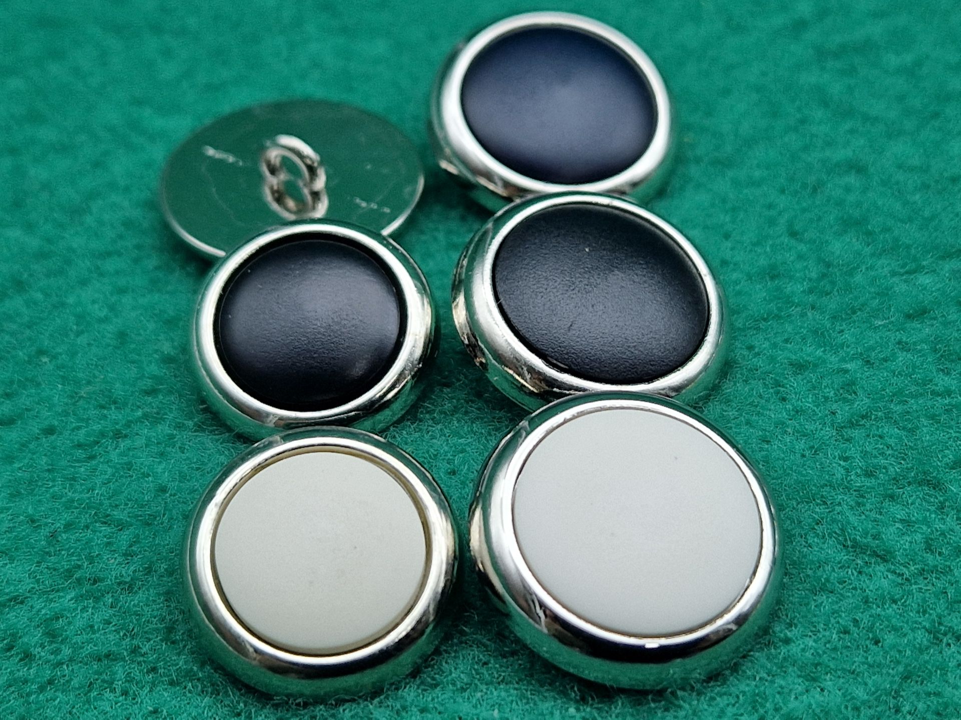 Bottoni in metallo finitura nichel con inserto centrale in poliestere satinato, con gambino, disponibili in due misure e tre colori.