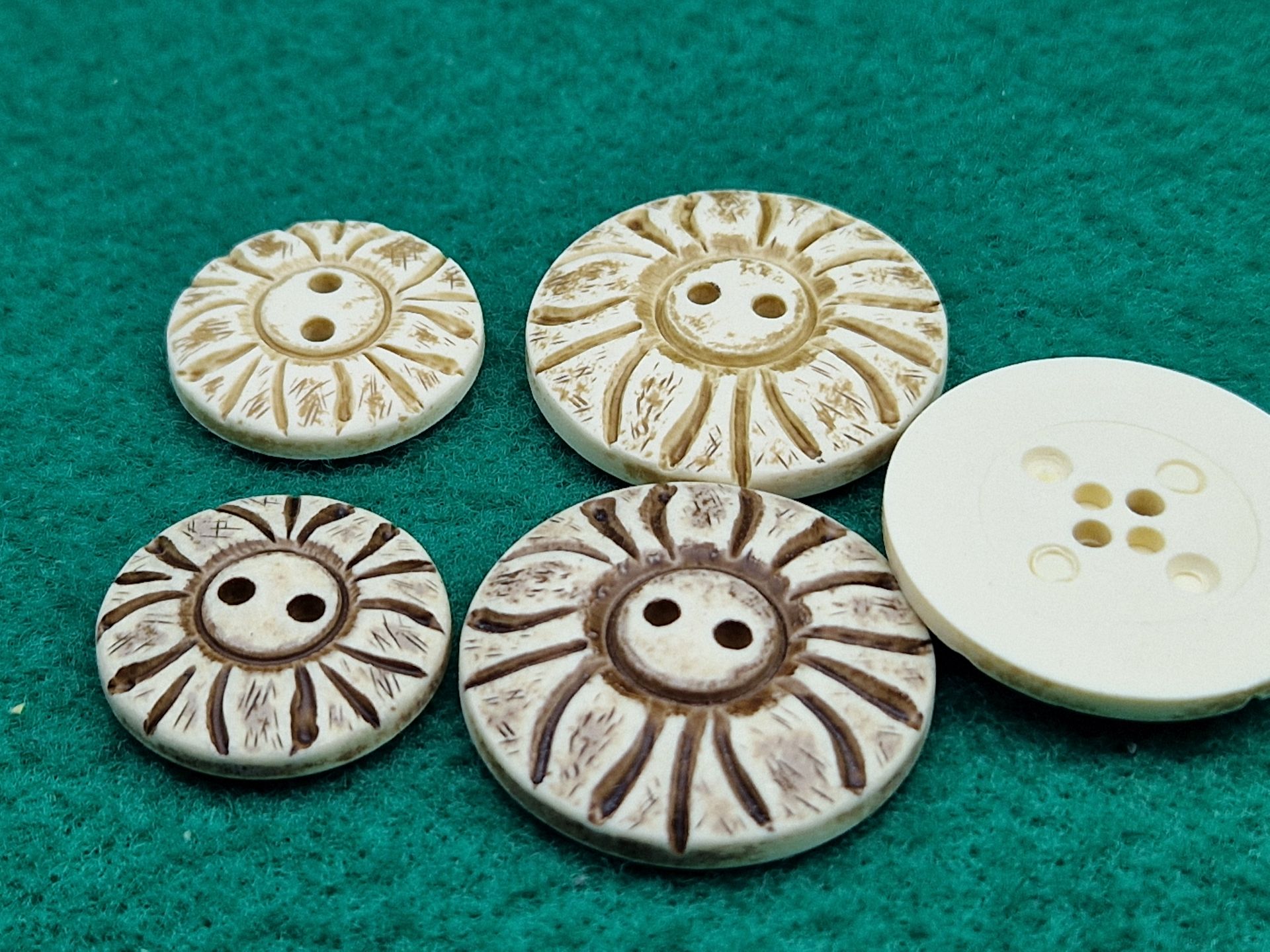Bottoni in nylon decorato con disegno tribale, inciso, a 2 fori, disponibili in due misure e due colori, sfumati con effetto vintage.