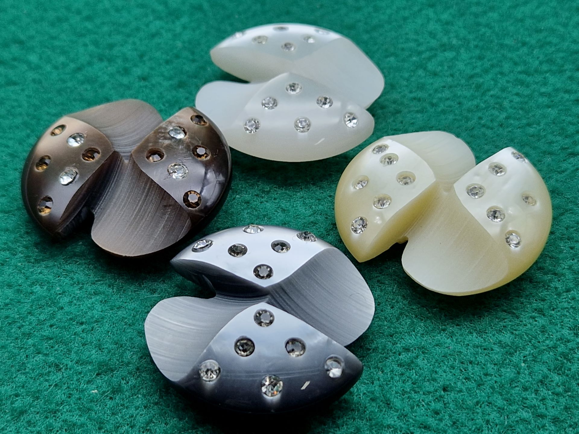 Bottoni pelliccia sagomati a girandola, decorati con luminosi strass, realizzati in poliestere, derivato da materiali di riciclo e a sua volta completamente riciclabile, proposto in quattro colori lucidi e madreperlati.