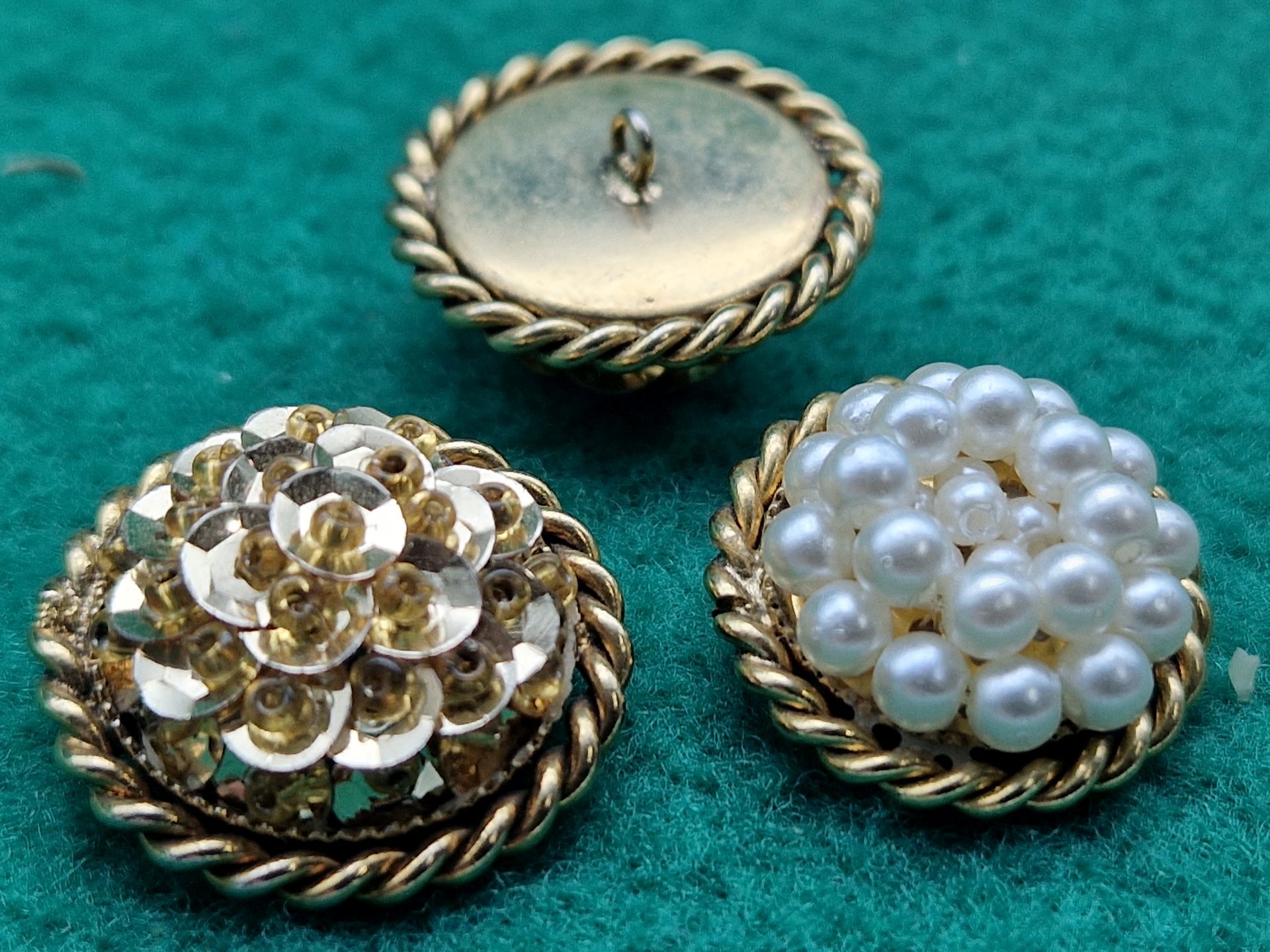 Bottoni gioiello, con gambino, realizzati a mano, composti da una base in ottone dorato finitura anticata, proposti in due modelli con perle o paillettes.