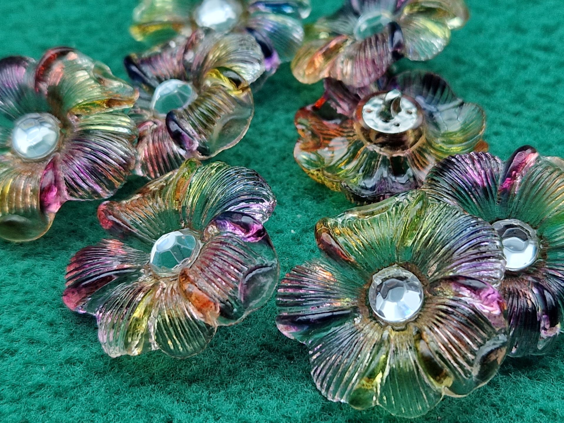 Bottoni strass fiore multicolore, realizzati in leggere nylon semitrasparente, materiale sintetico totalmente riciclabile, dalle sfumature arcobaleno, con gambino in metallo dorato e grande strass centrale, disponibile nella misura diametro cm 3.