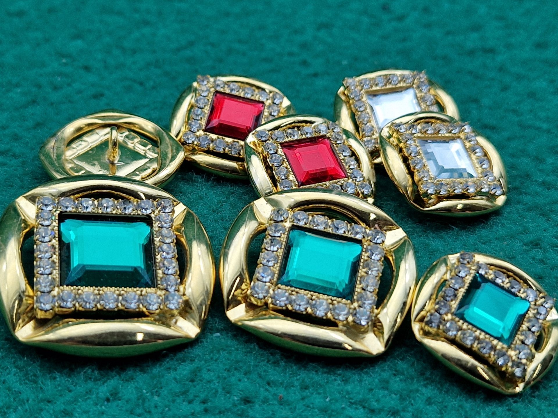 Bottoni in pregiato ottone dorato, con cornice interna ricoperta di luminosi strass e grande pietra acrilica colorata al centro, con gambino, disponibili in tre misure e tre colori.