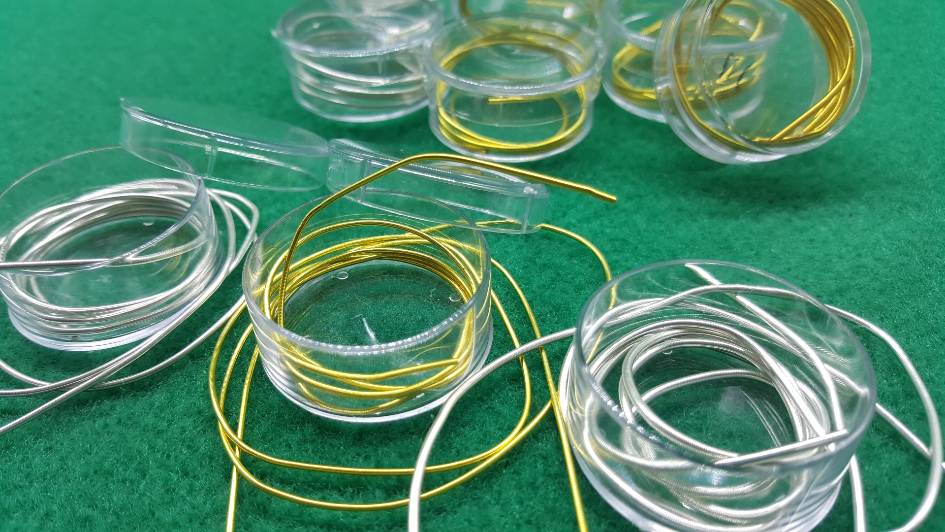 Filo in metallo, sottilissimo e avvolto a spirale, come una molla, proposto in tre misure e in finitura oro e argento, fornito in pratica scatolina trasparente con coperchio contenente circa cm 50.