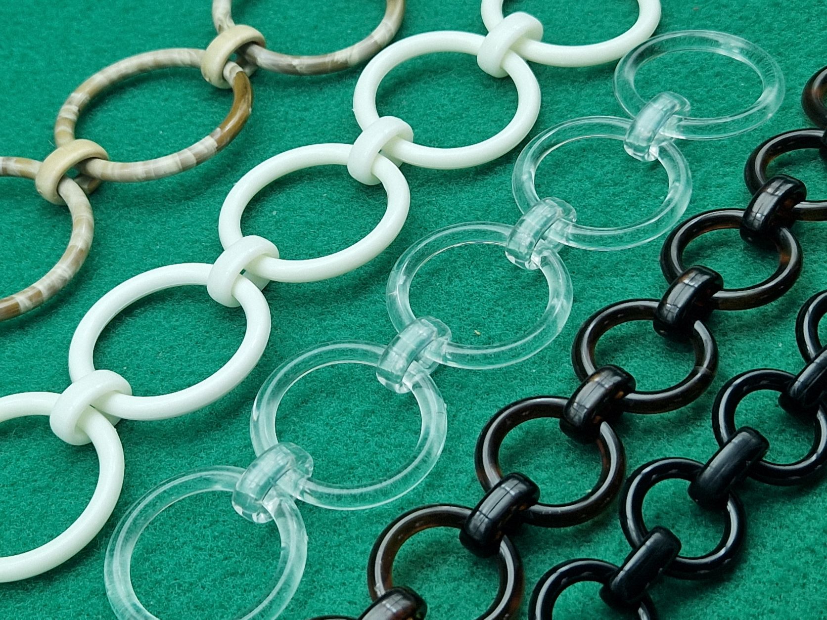 Catena acrilica formata con anelli perfettamente circolari, disponibile in cinque misure, nei colori bianco, nero e trasparente e nelle particolari sfumature a imitazione corno e tartaruga.