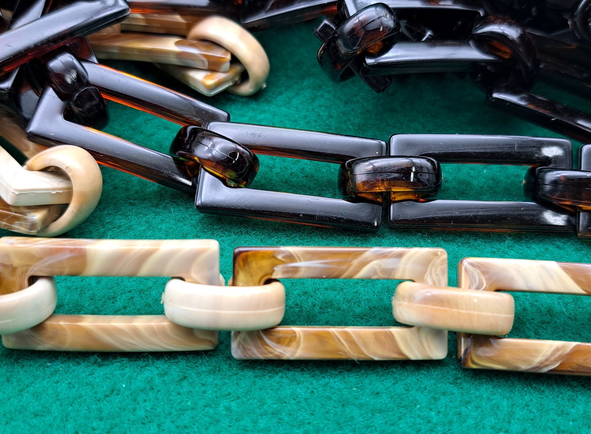 Catena a maglie rettangolari, in materiale acrilico, leggera e resistente, disponibile in tre colori e nelle originali sfumature a imitazione corno e tartaruga.