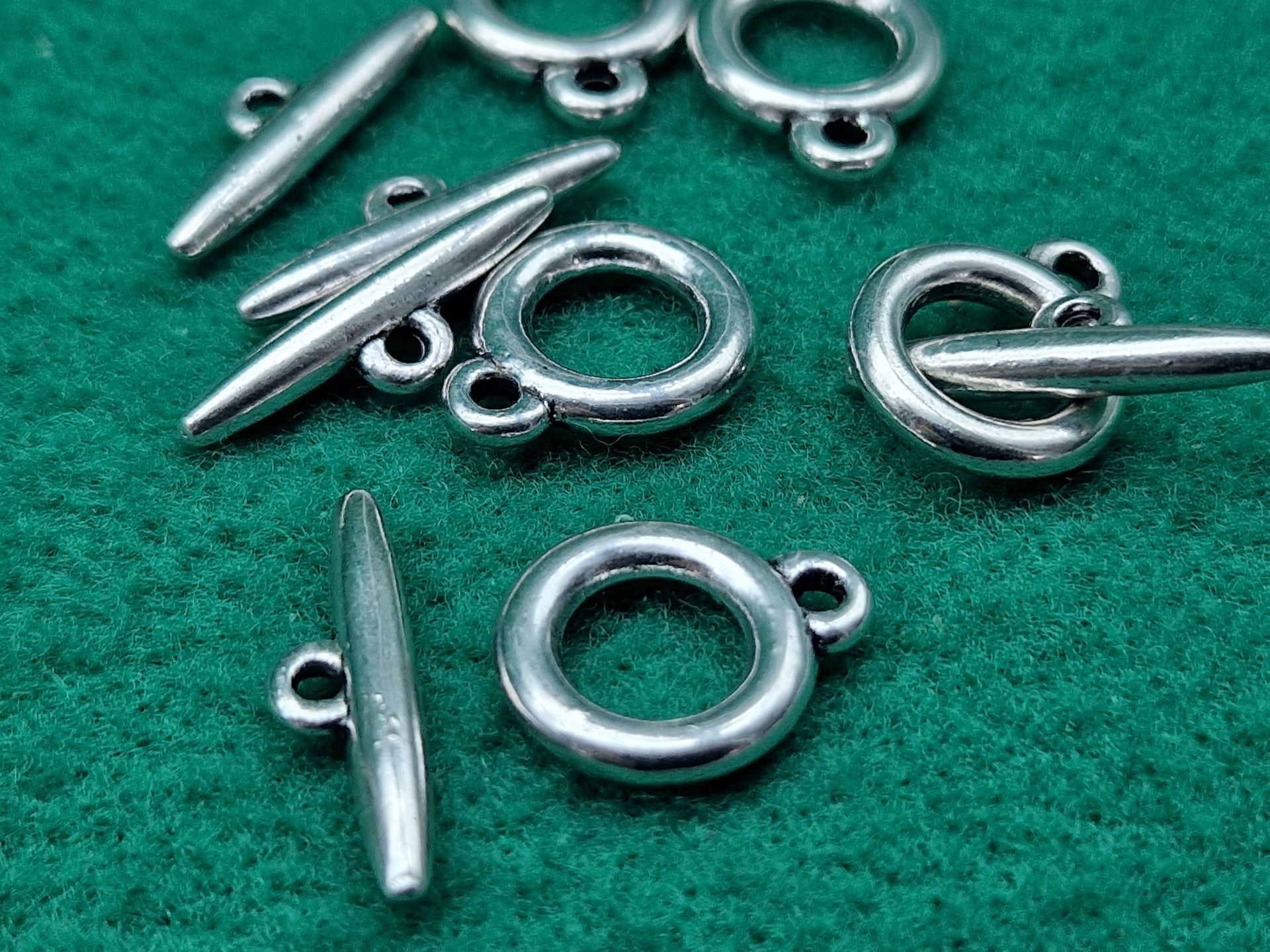 Chiusura a T per collana, composta da un anello, diametro esterno cm 1,5, interno cm 1 circa, e da una barretta lunga cm 2,5, con anelli a cui agganciare uno o più fili, disponibile in finitura nichel.