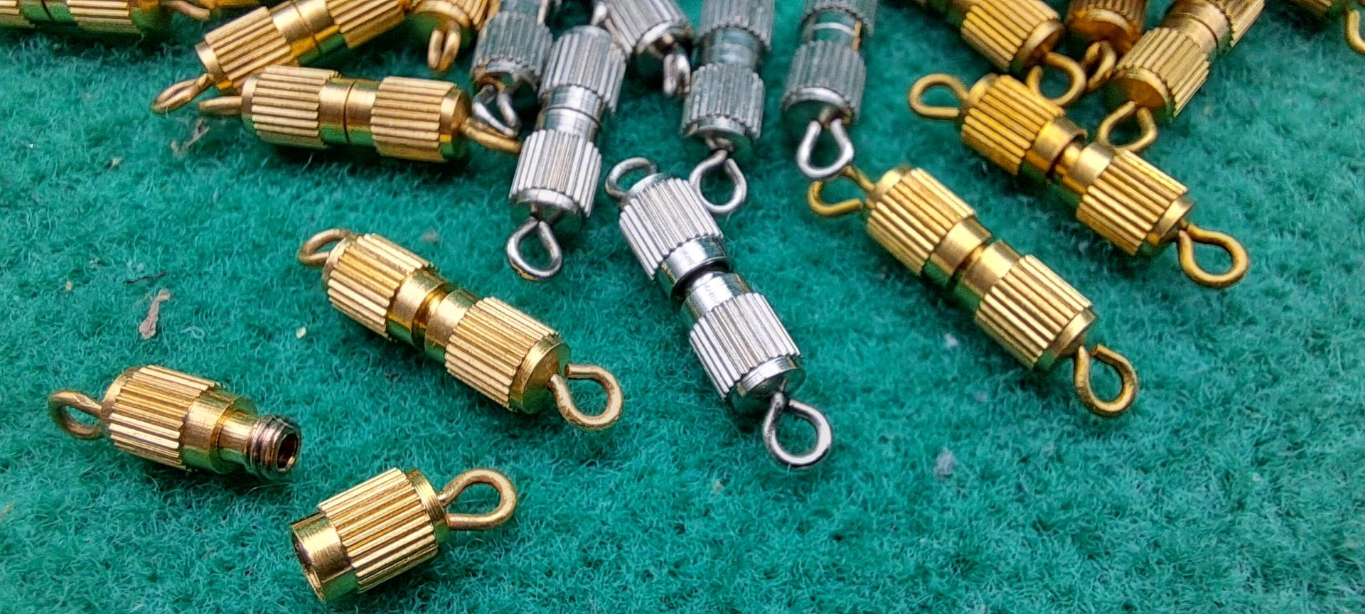 Chiusure per collane a un filo, realizsate in pregiato ottone, mm 20 x 5, decorate da sottili incisioni orizzontali, divise al centro da perno a vite a scomparsa, disponibili in tre finiture.