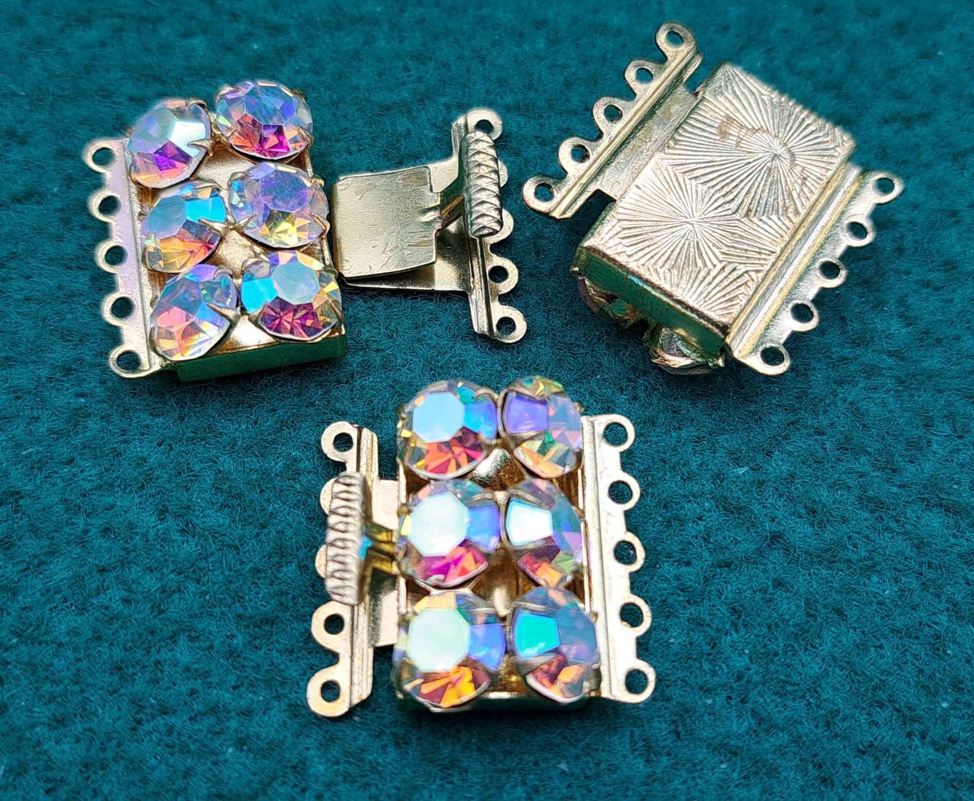 Fermagli per collane e bracciali di forma rettangolare, parte superiore leggermente curva e decorata con quattro grandi e luminosi strass finitura AURORA BOREALE, dalle caratteristiche sfumature multicolori, e parte inferiore incisa al laser con motivo a raggiera.
