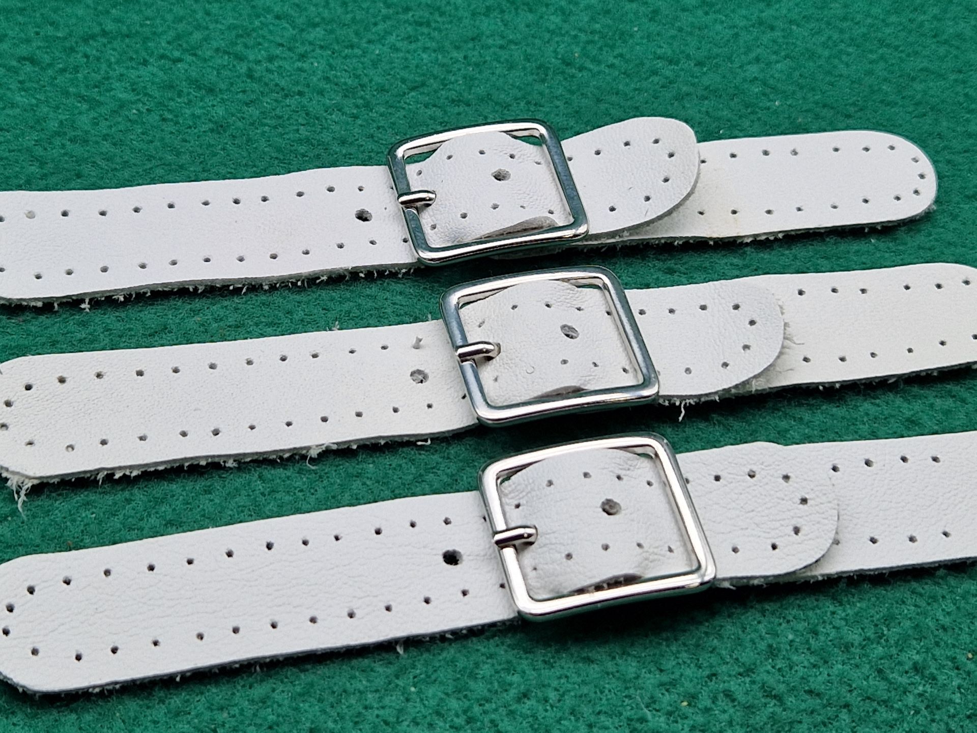 Cinturini kilt realizzati in morbida pelle bianca, con fibbia in finitura nichel, lunghezza totale chiusa cm 17, altezza cm 2.