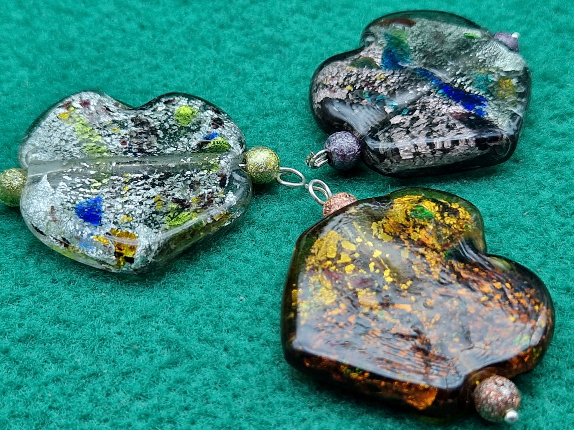 Ciondoli pasta di vetro cuore, perle in pasta vitrea colorata, altezza circa cm 4,5×3,5, disponibili in tre colori.