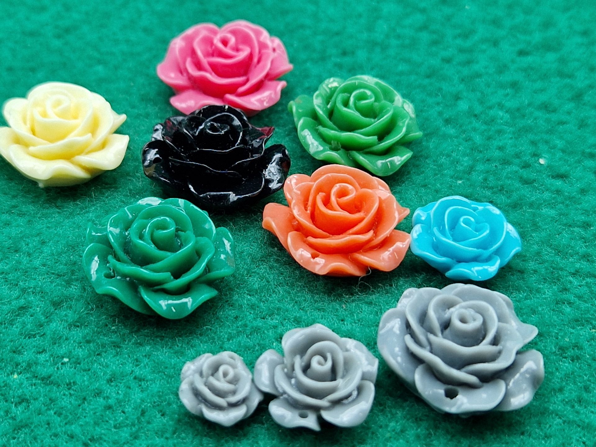 Fiore in resina acrilica, lucida e leggermente madreperlata, tridimensionale, con ampio foro su uno dei petali e base piatta, disponibile in tre misure e otto colori.