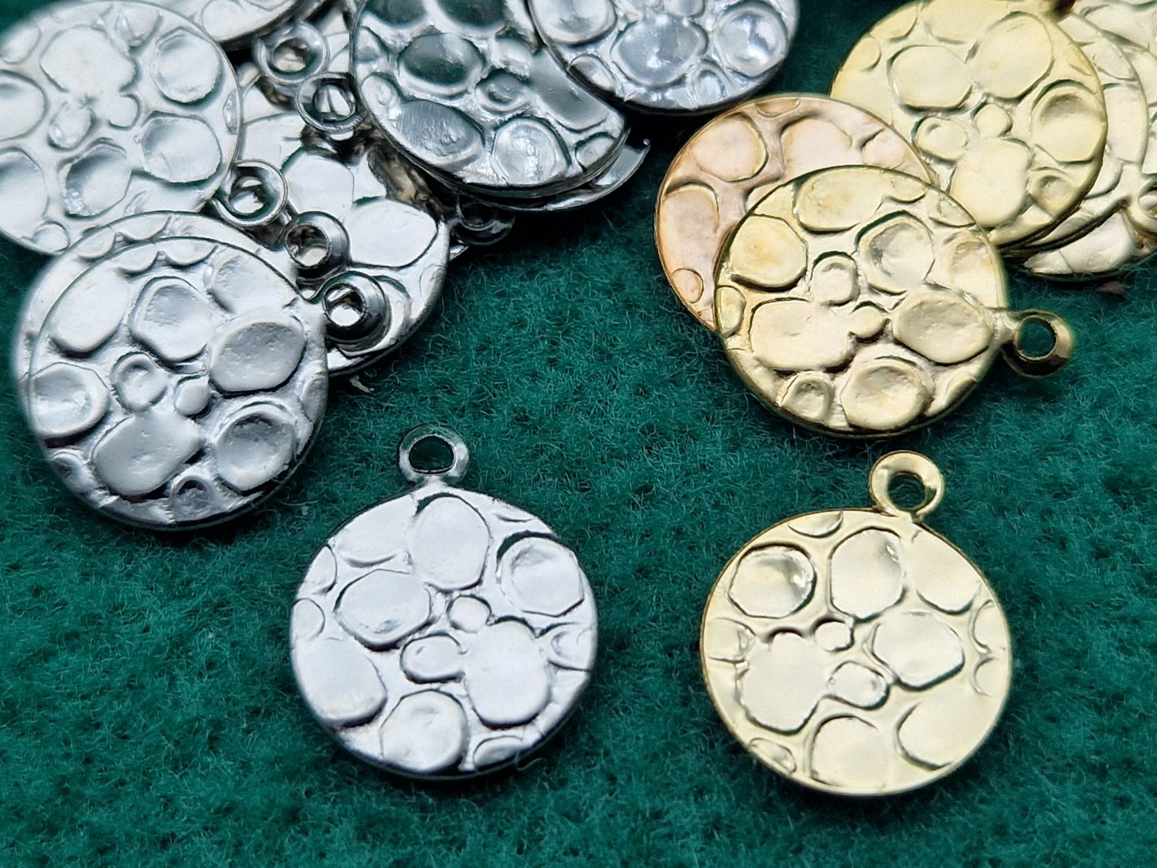Decorazione per bigiotteria con lavorazione in rilievo, bolli irregolari si rincorrono sull’intera superficie di entrambi i lati, perfetta come pendente per spiritosi braccialetti, orecchini e bigiotteria in genere.