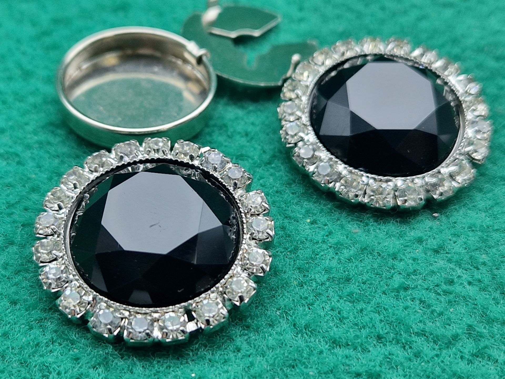 Copri-bottone strass, creazione artigianale esclusiva, con chiusura a incastro, decorato da una corona di luminosi strass strass taglio diamante, luminosissimi, e una grande pietra acrilica sfaccettata.