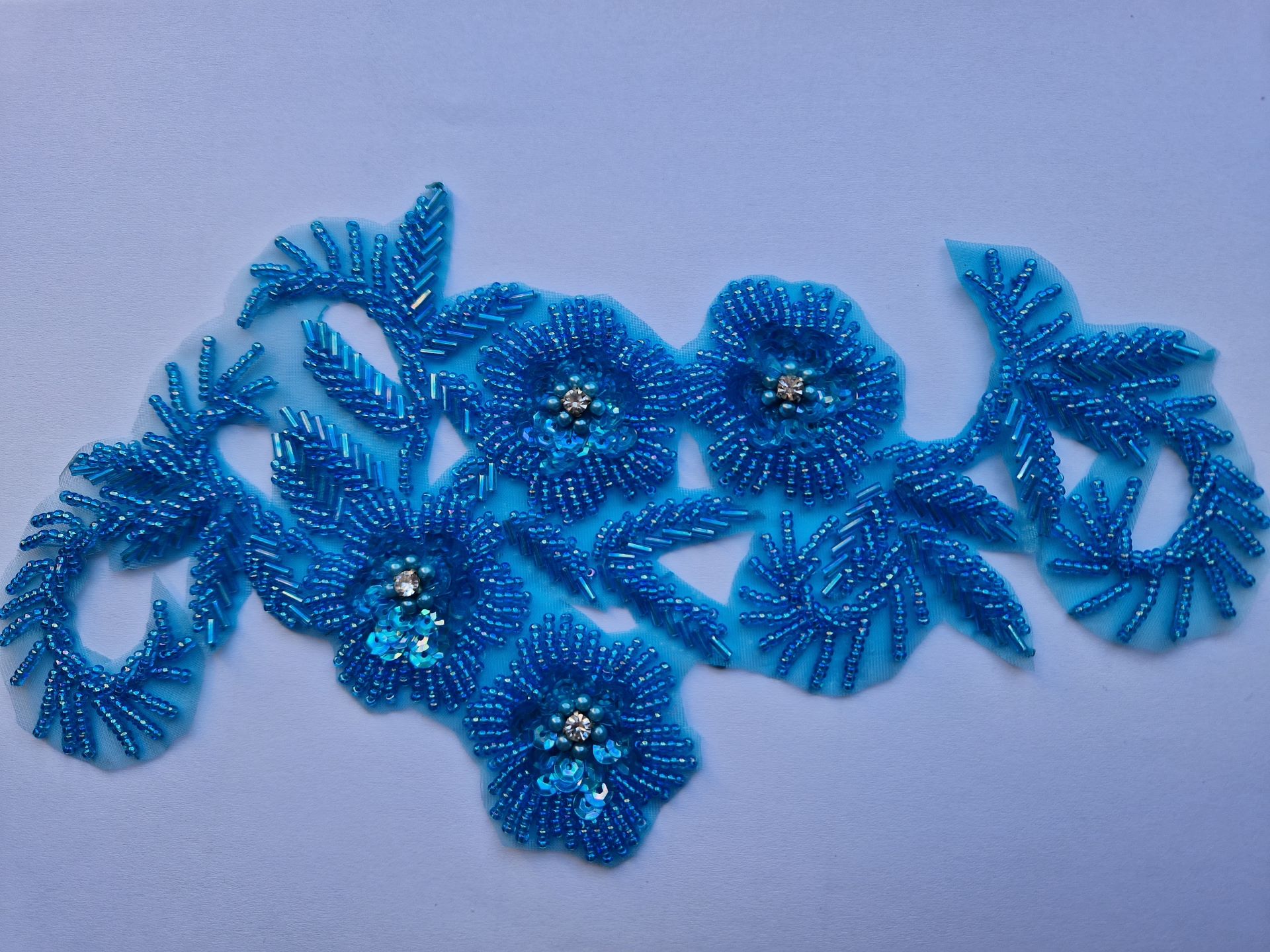 Decorazione per abiti, un ricco ricamo realizzato a mano su leggero tessuto, tono su tono, con paillettes, tubetti e perle in vetro, dalla forma di un ramo fiorito con foglie e luminosi strass, proposta nel colore turchese, considerato un talismano.