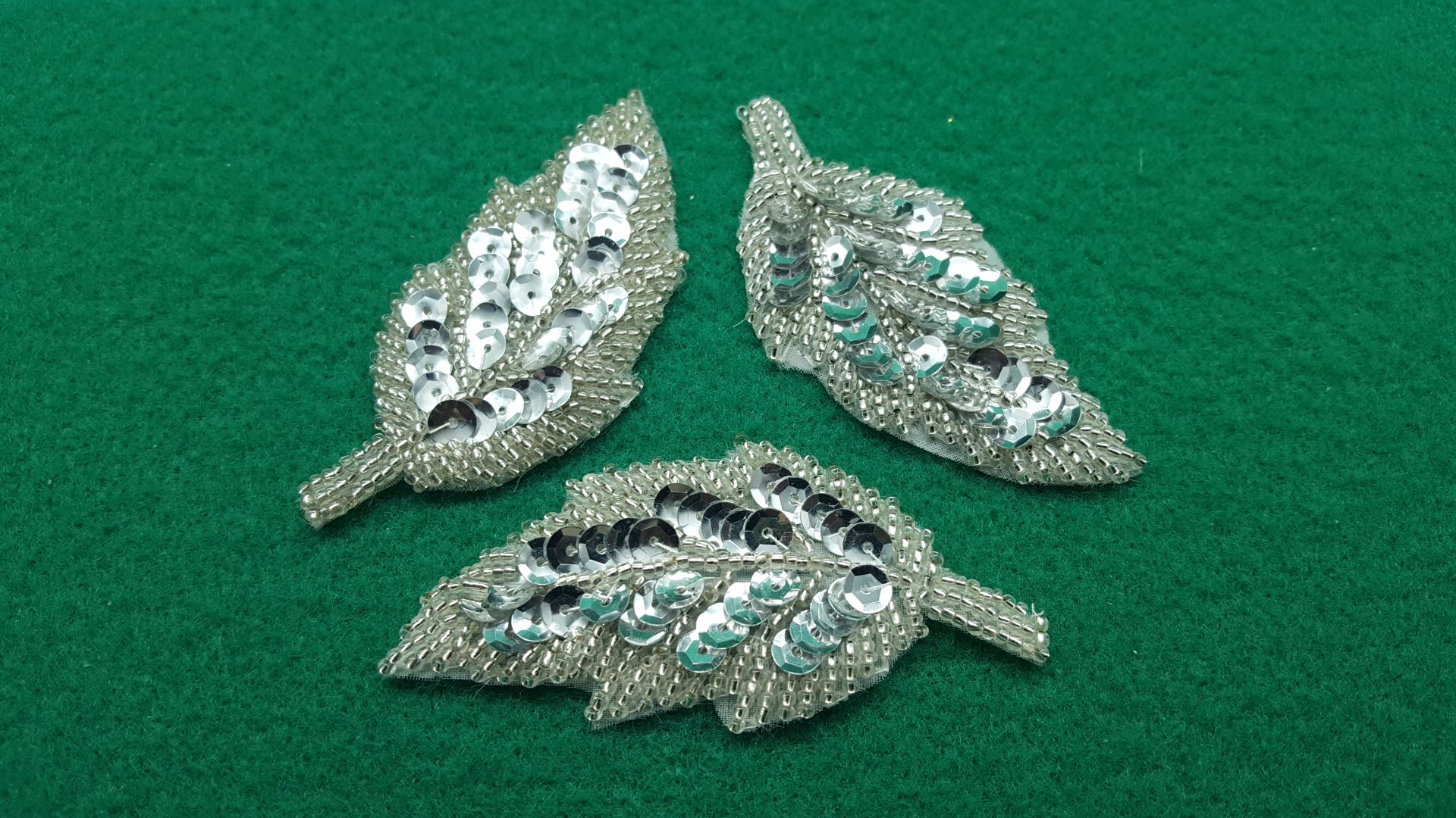 Un ricamo realizzato su leggero tessuto, con pailletts che definiscono le nervature interne della foglia, proposta nel colore argento, luminoso e adatto a più occasioni.