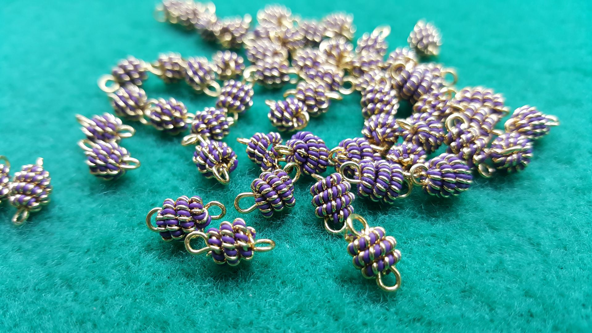 Distanziatore per bigiotteria, realizzato in pvc glicine e filo metallico dorato.