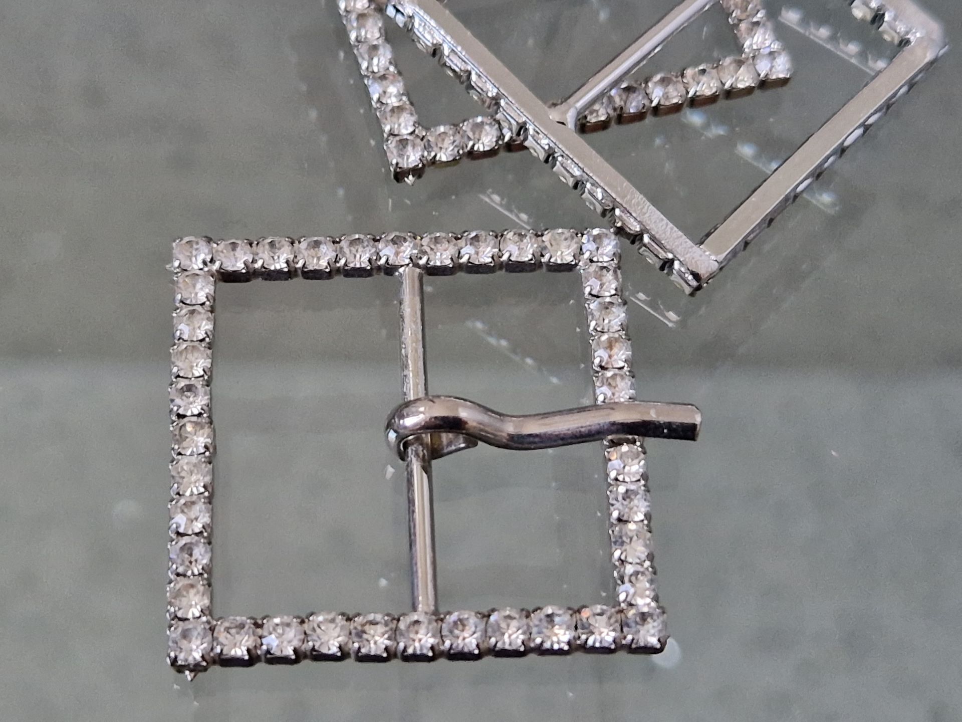 Fibbia strass quadrata passo cm 3, dimensione esterna/lato cm 3,5, completa di ardiglione.
