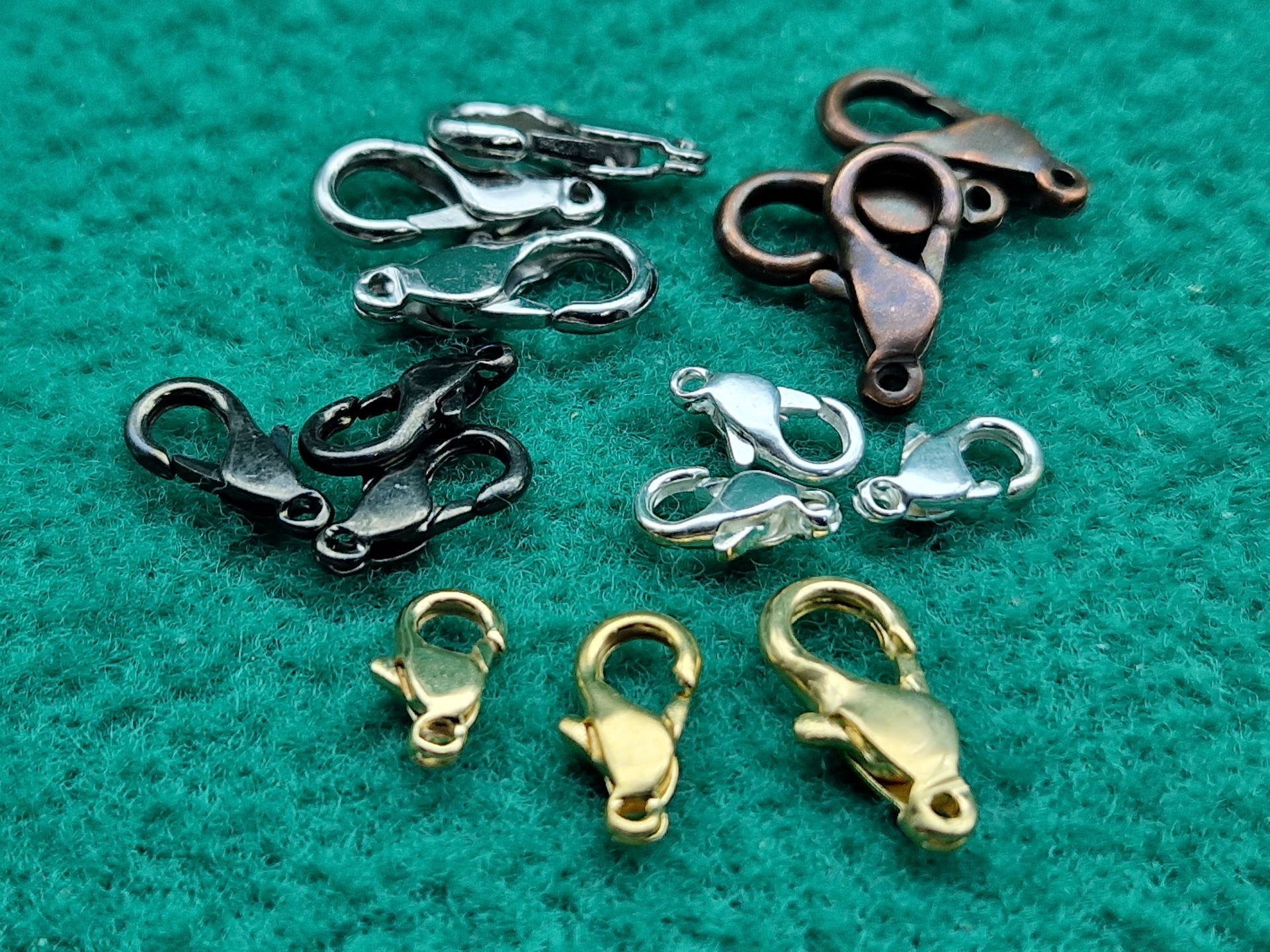 Chiusura a moschettone, di forma allungata, realizzato in pregiato ottone, disponibile in tre misure e cinque diverse finiture.