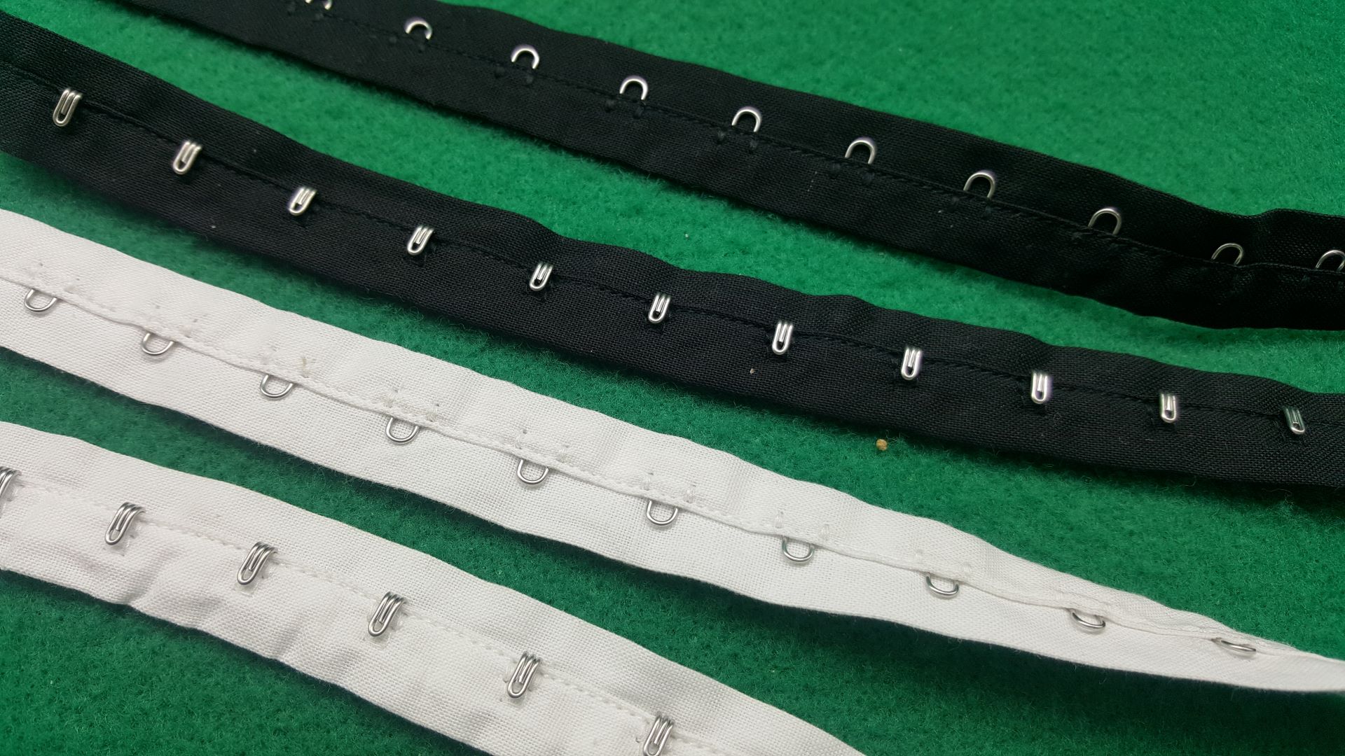 Nastro con uncinelli, realizzato con tessuto in cotone altezza cm 2, colore bianco o nero, composto da due parti complementari, una con ganci e l’altra con anelli, perfetto per corsetteria e lingerie in genere.