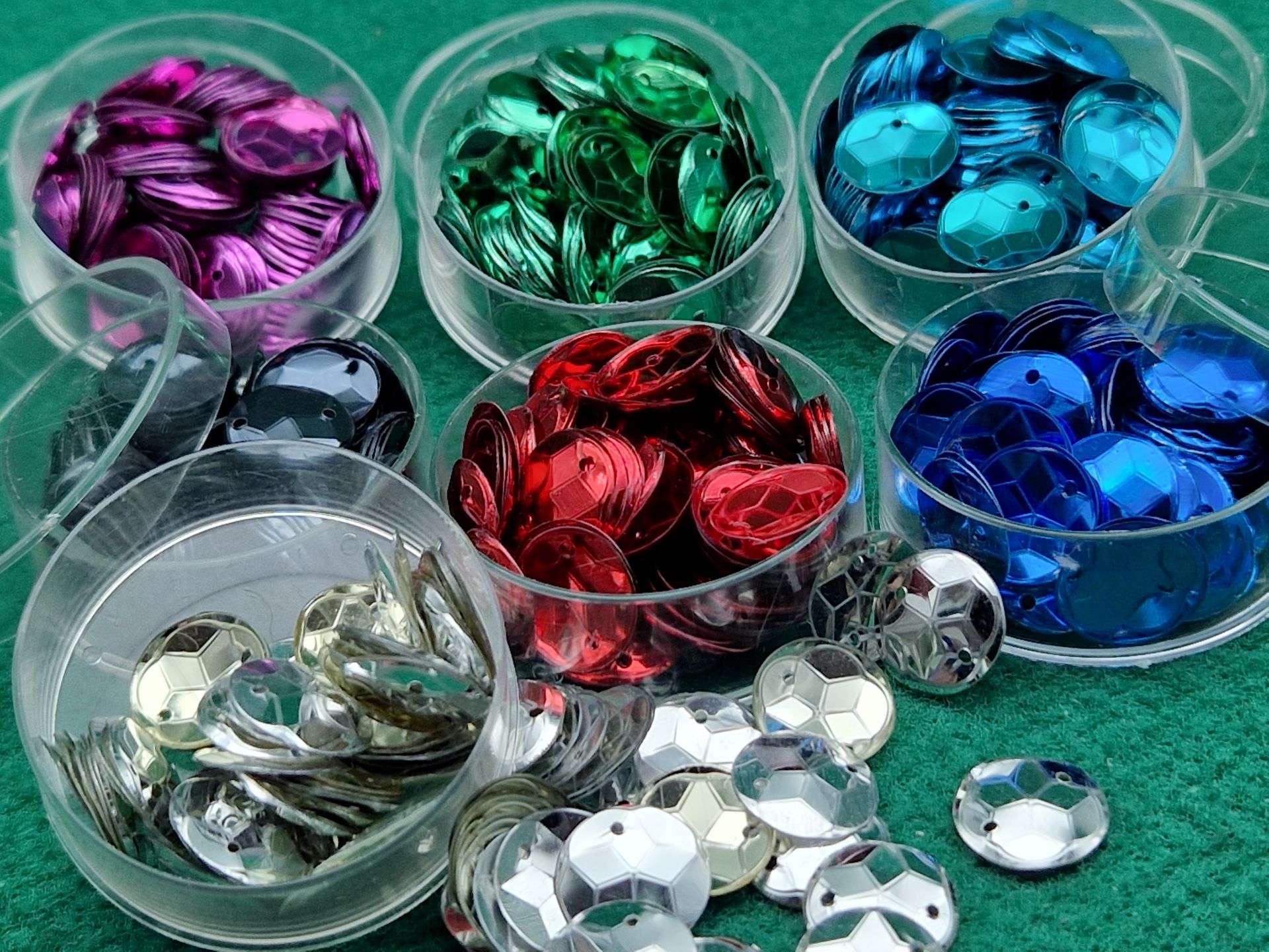 Articolo merceria e bigiotteria, lustrini utilizzati per decorare abbigliamento, borse e accessori, e, con l’ausilio di specifica colla, di contenitori, arredi e complementi di arredo.