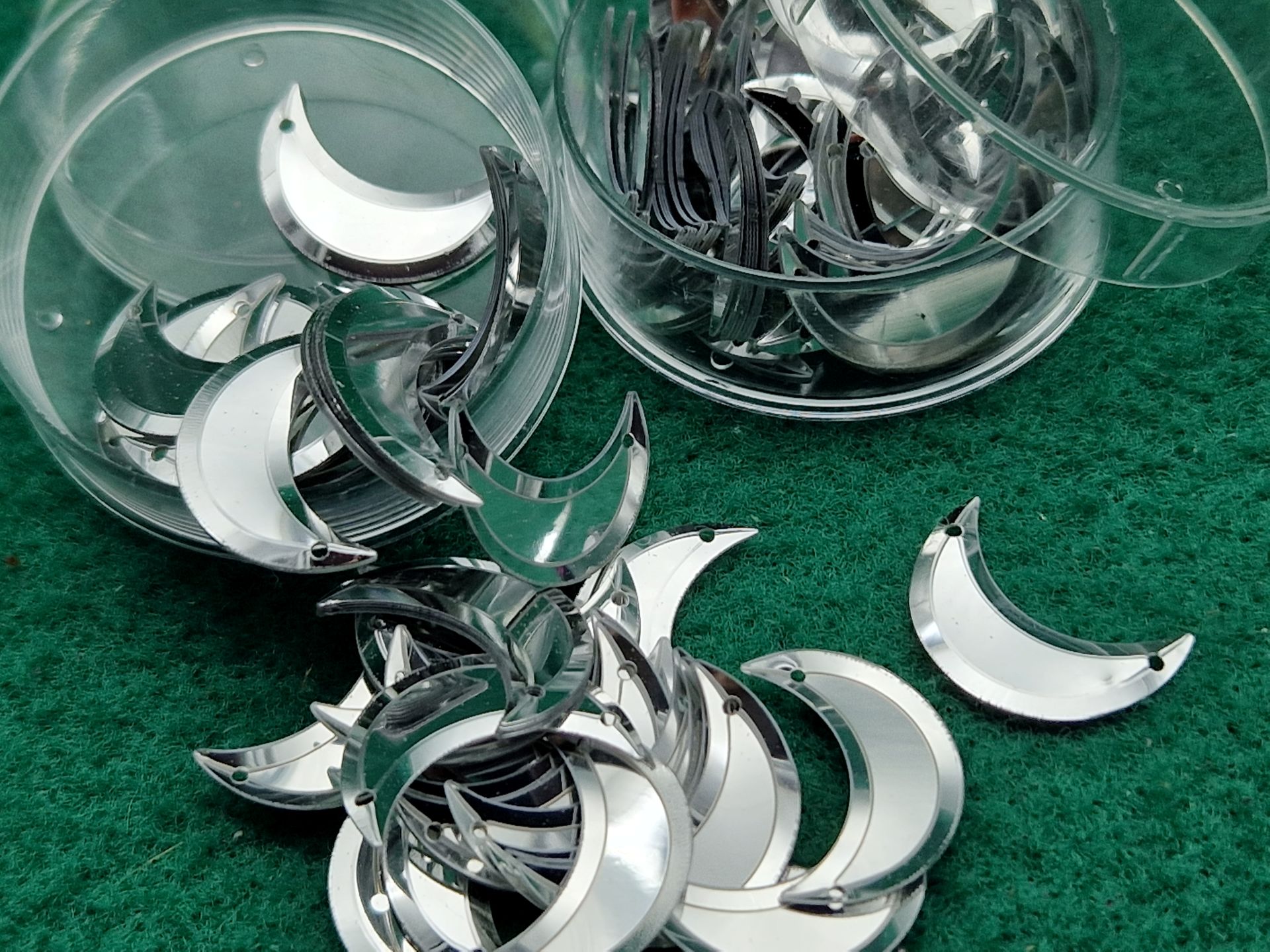Paillettes FALCE DI LUNA, dimensioni cm 2 x 1, con 2 fori alle estremità, disponibili nel colore argento metallizzato, fornite in comode scatoline trasparenti con coperchio, diametro mm 40 x h mm 15.