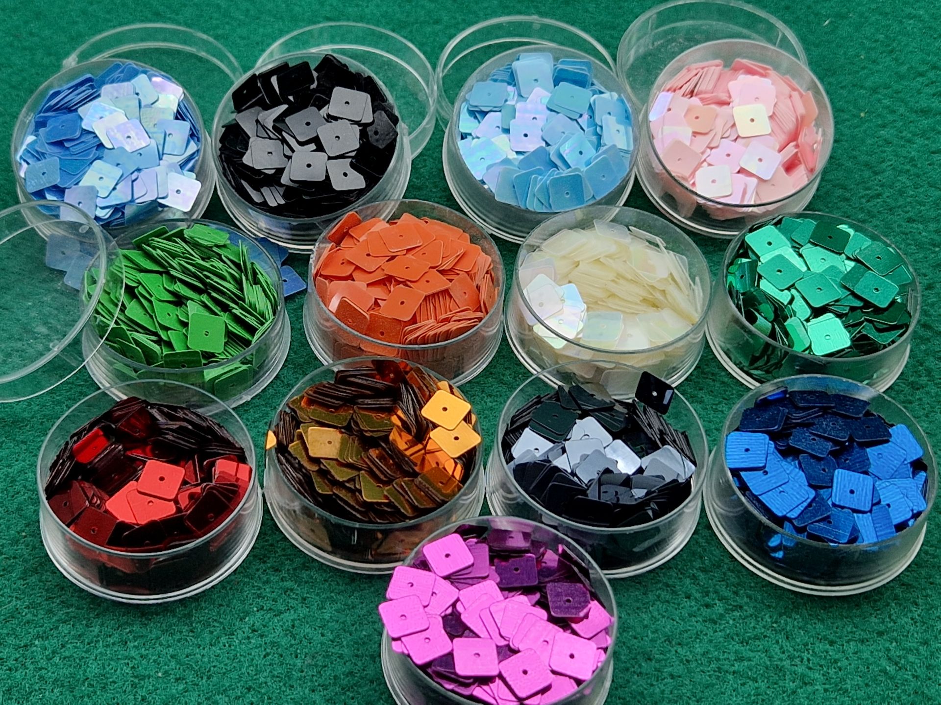 Paillettes di forma quadrata, lato mm 7, disponibili in tredici colori, lucidi e riflettenti, alcuni metallizzati, altri semitrasparenti, fornite in pratiche e comode scatoline trasparenti con coperchio.