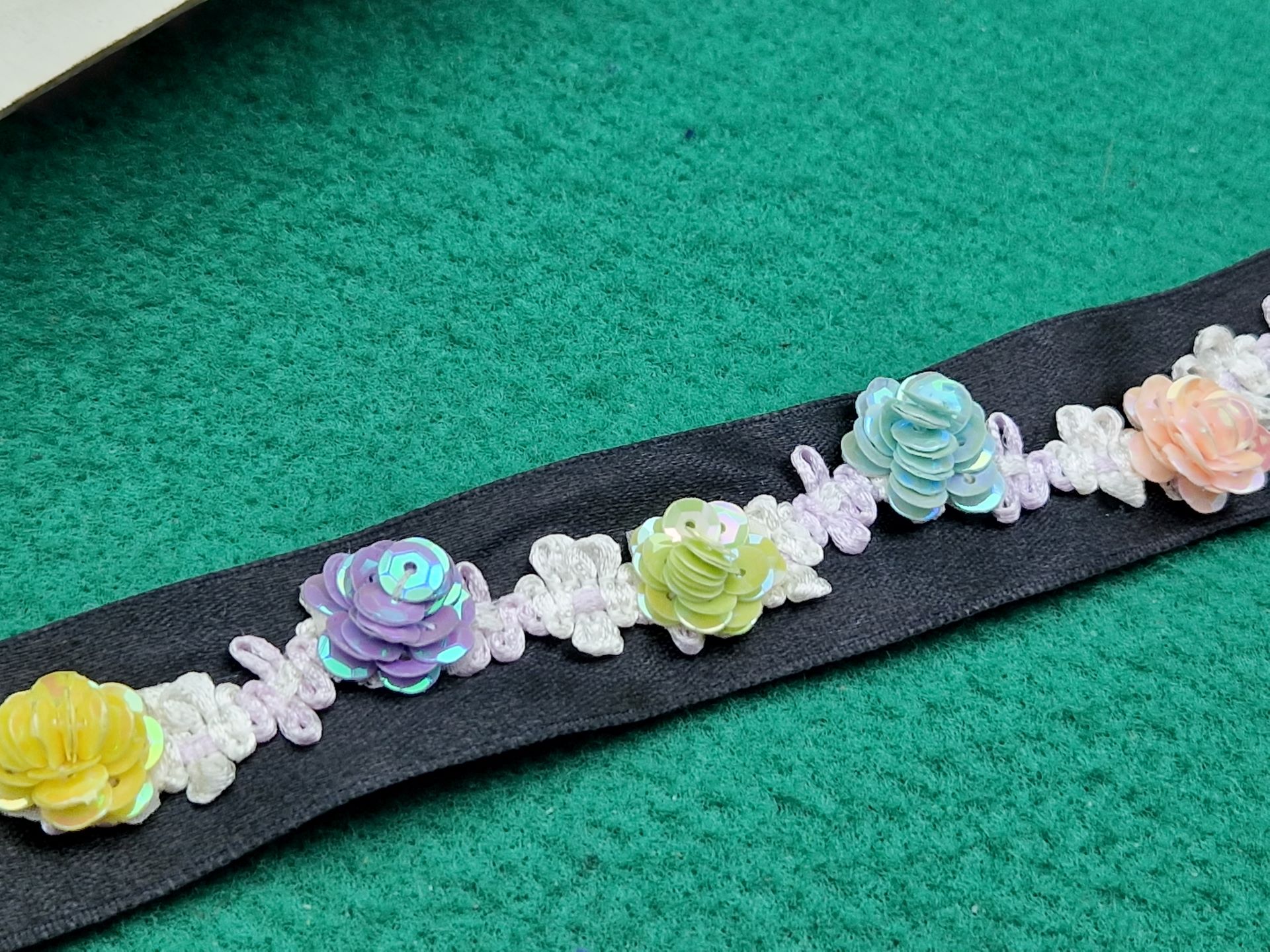 Passamaneria in raso di colore nero, altezza cm 2,5, decorata con ricamo in lucido cordoncino bianco e piccoli fiori in rilievo, realizzati in paillettes acetate dai riflessi iridescenti.
