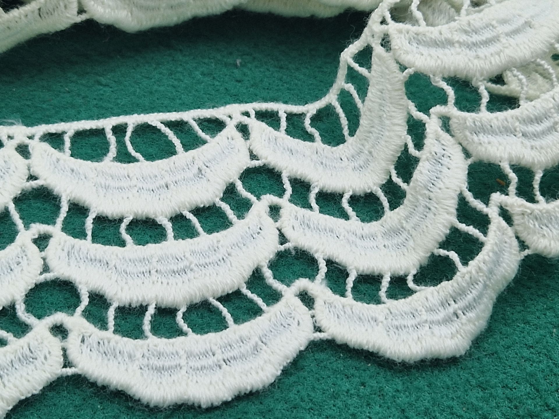 Pizzo morbido al tatto, soffice e decorativo, da utilizzare anche come bordo per copriletti, asciugamani e tovaglie, decorazione di borse e cappelli.