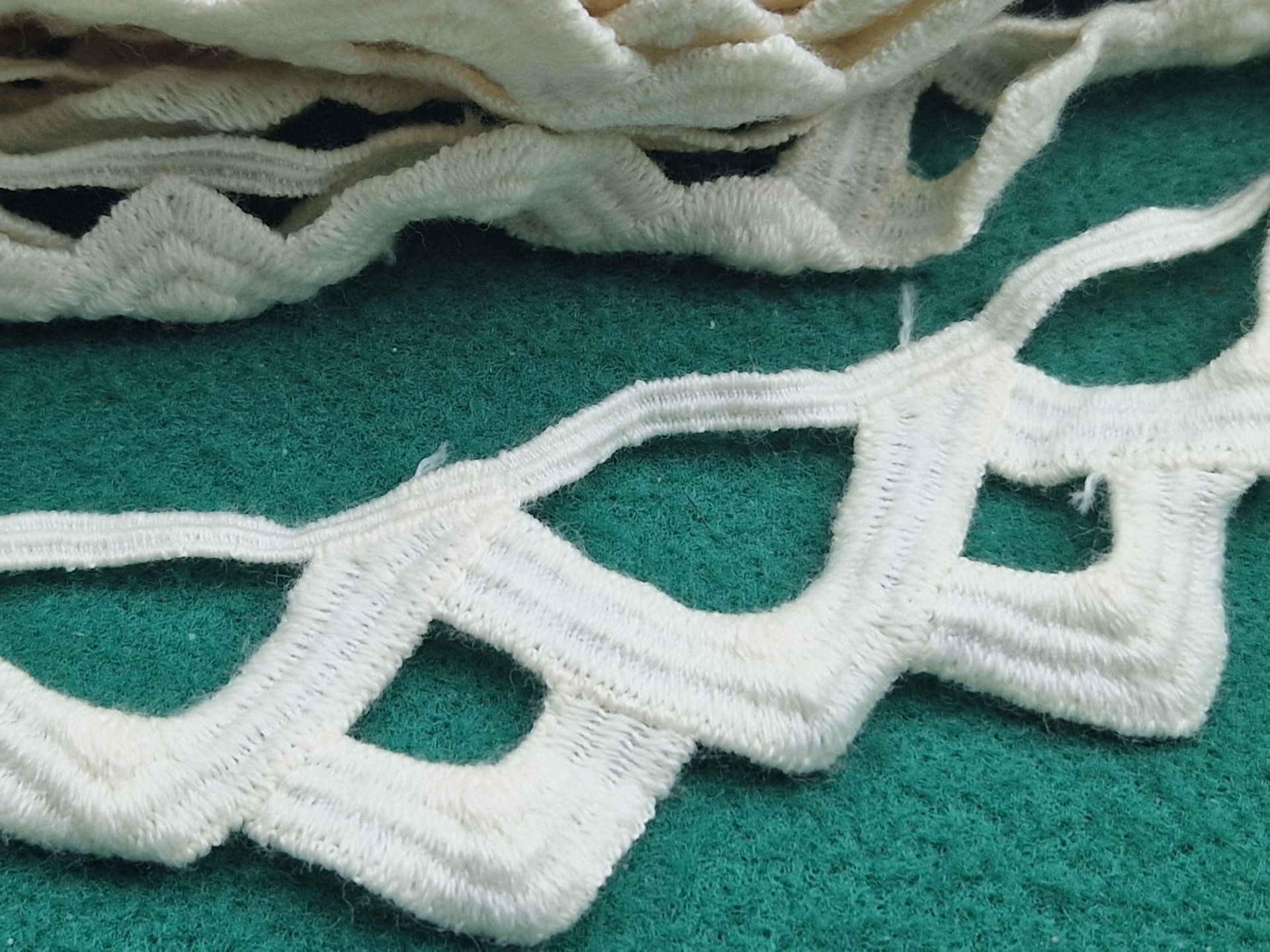 Passamaneria dal motivo geometrico, soffice e moderna, altezza cm 5, realizzata in leggero filato di cotone al naturale.