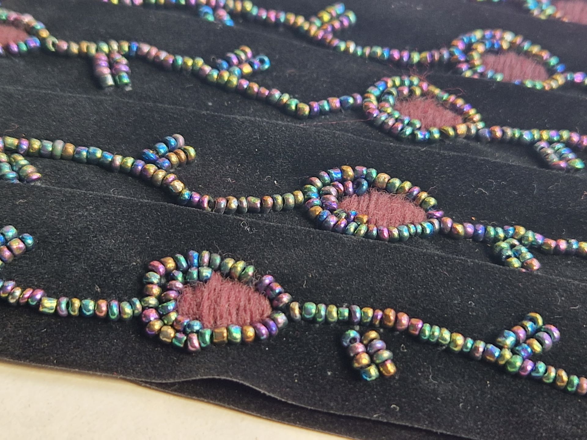 Passamaneria in velluto colore nero ricamata a mano con perline in vetro colore scarabeo, dai mille riflessi cangianti, altezza cm 2,5.