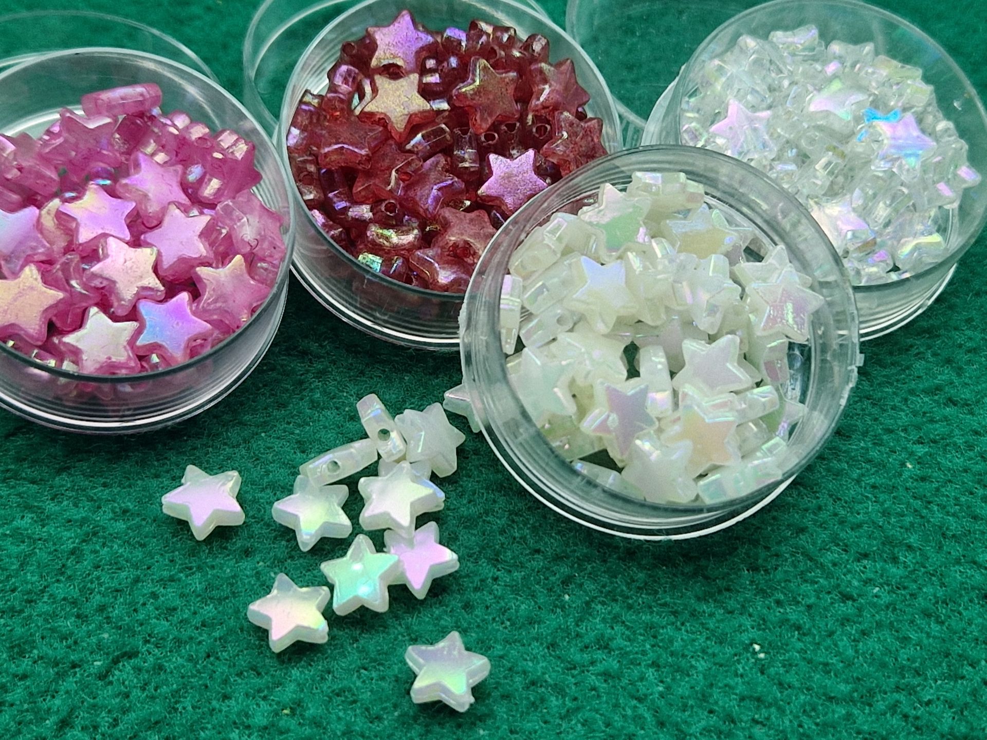 Perle in materiale acrilico, forma a stella a 5 punte , diametro mm 8, disponibili in quattro colori, fornite in pratiche scatoline trasparenti, dimensioni mm 40x h 15, contenuto circa 50 pezi.