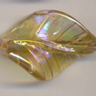 Perle in vetro dalla forma di foglia allungata e leggermente accartocciata, realizzate a mano, con venature in rilievo e con foro passante, disponibili in cinque colori, cangianti e semitrasparenti.