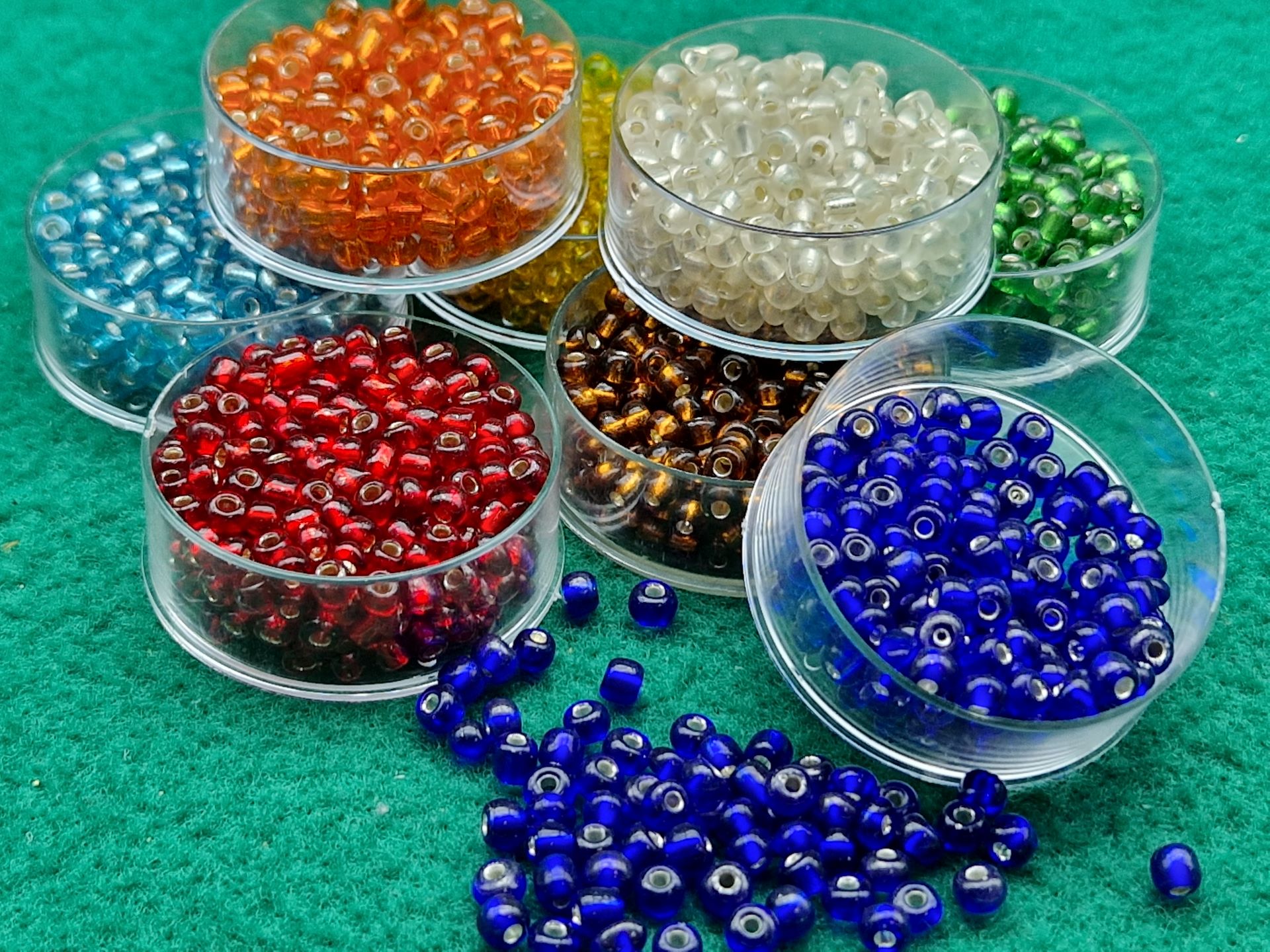 Perline in vetro, ovvero conteria, per ricami e decorazioni, proposto in comode scatoline trasparenti con coperchio.
