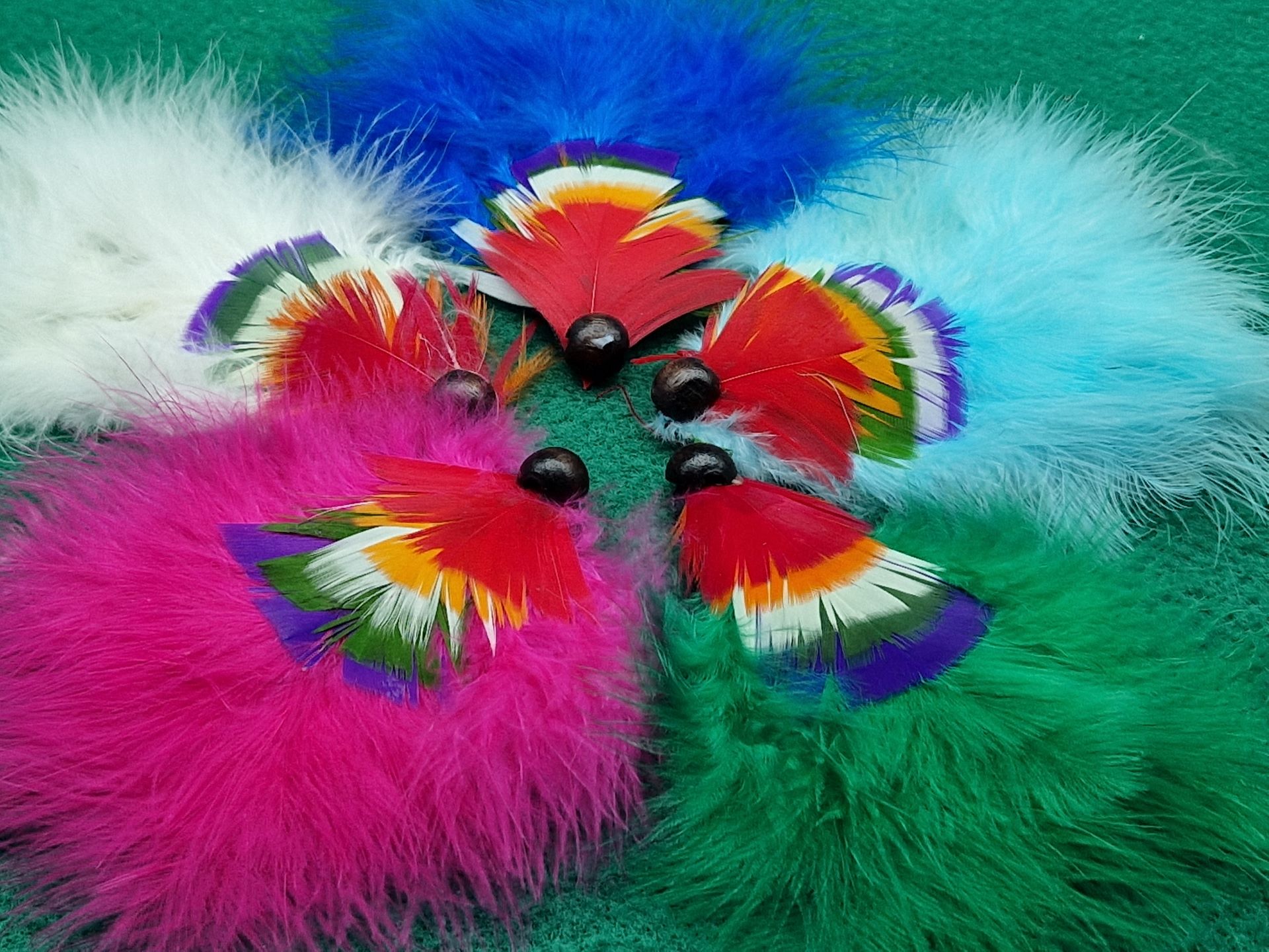 Spille realizzate a mano, con vere piume, soffici e vaporose, disposte a scalare a riprodurre quelle della magnifica ruota del pavone, disponibili in sei diversi colori, dimensioni cm 10×8 circa.