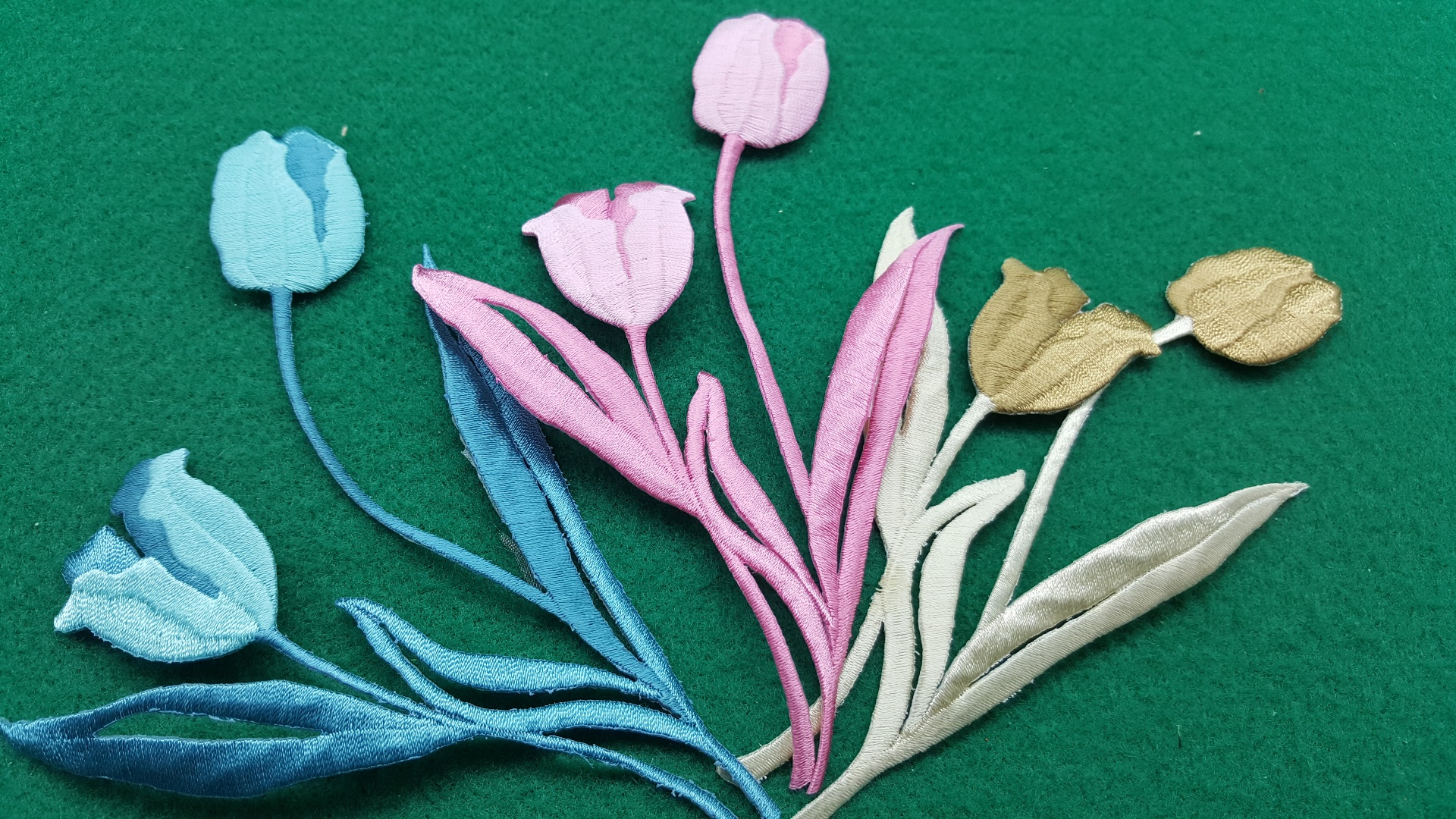 Decorazione per abiti e non solo, leggerissima, dalla forma di tulipani con gambo e foglie, realizzata con materiale flessibile, morbido al tatto, ricamata con lucido filato.