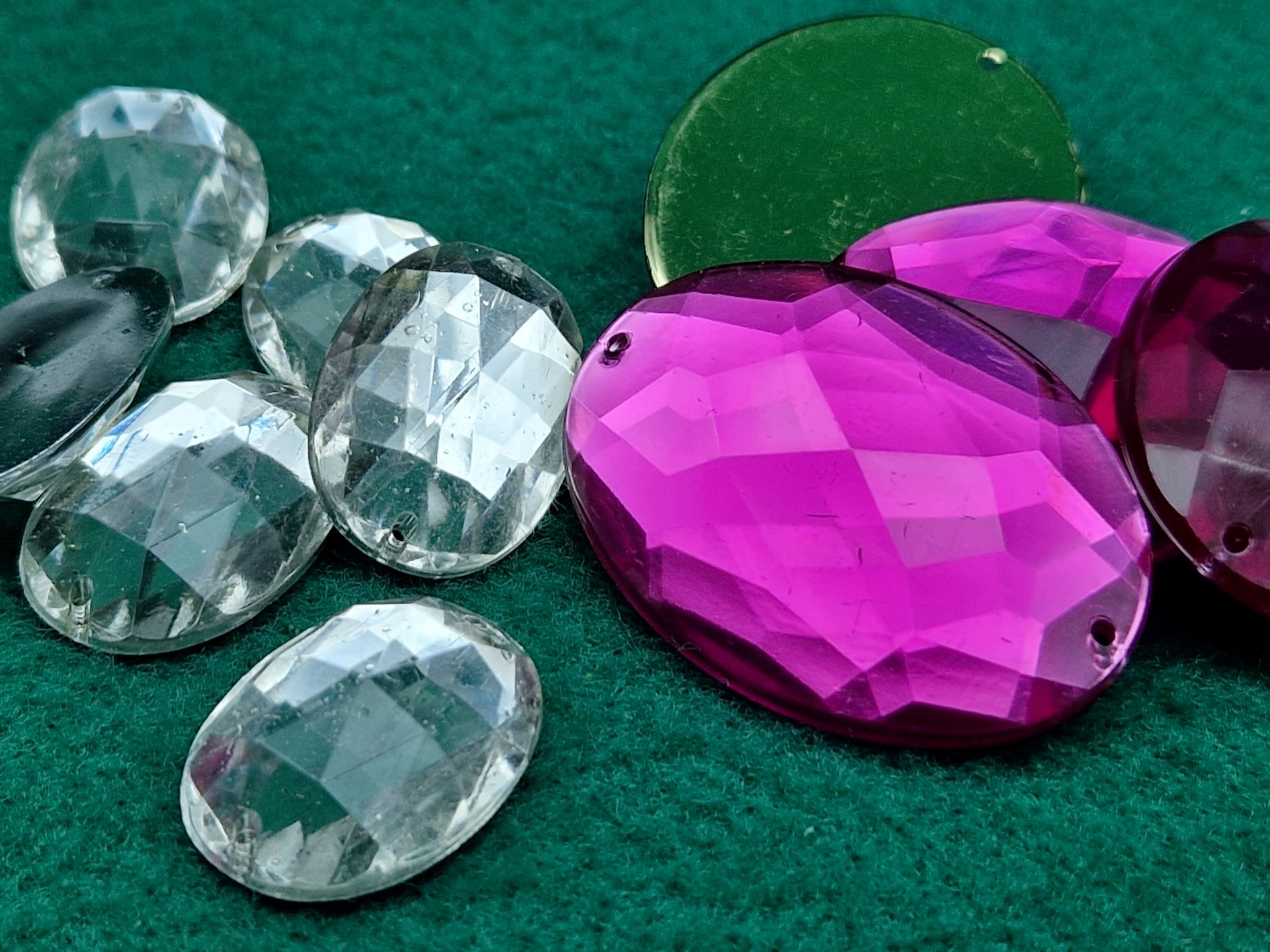 Strass acrilici di grandi dimensioni, con base specchiata, due fori laterali e innumerevoli sfaccettature, molto luminosi, disponibili in due misure e due colori.